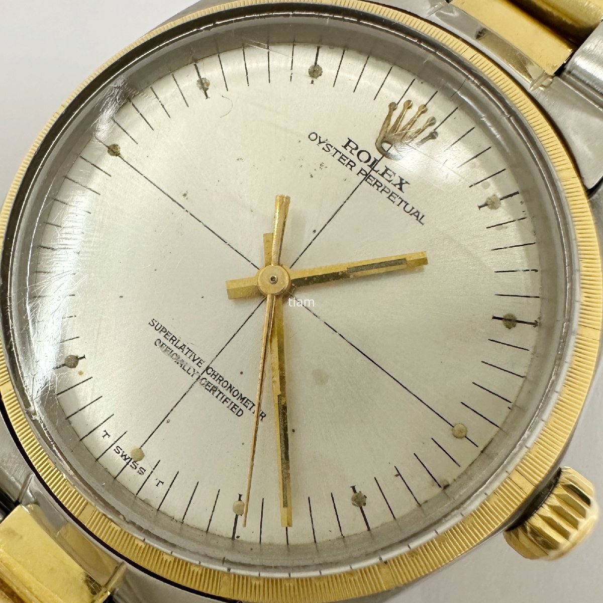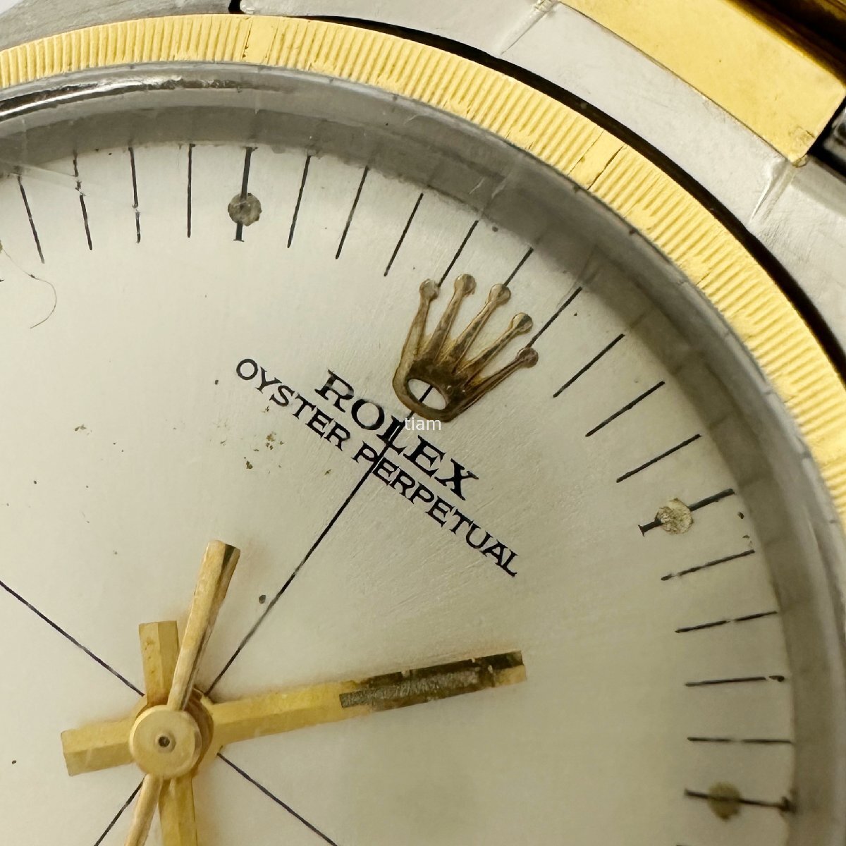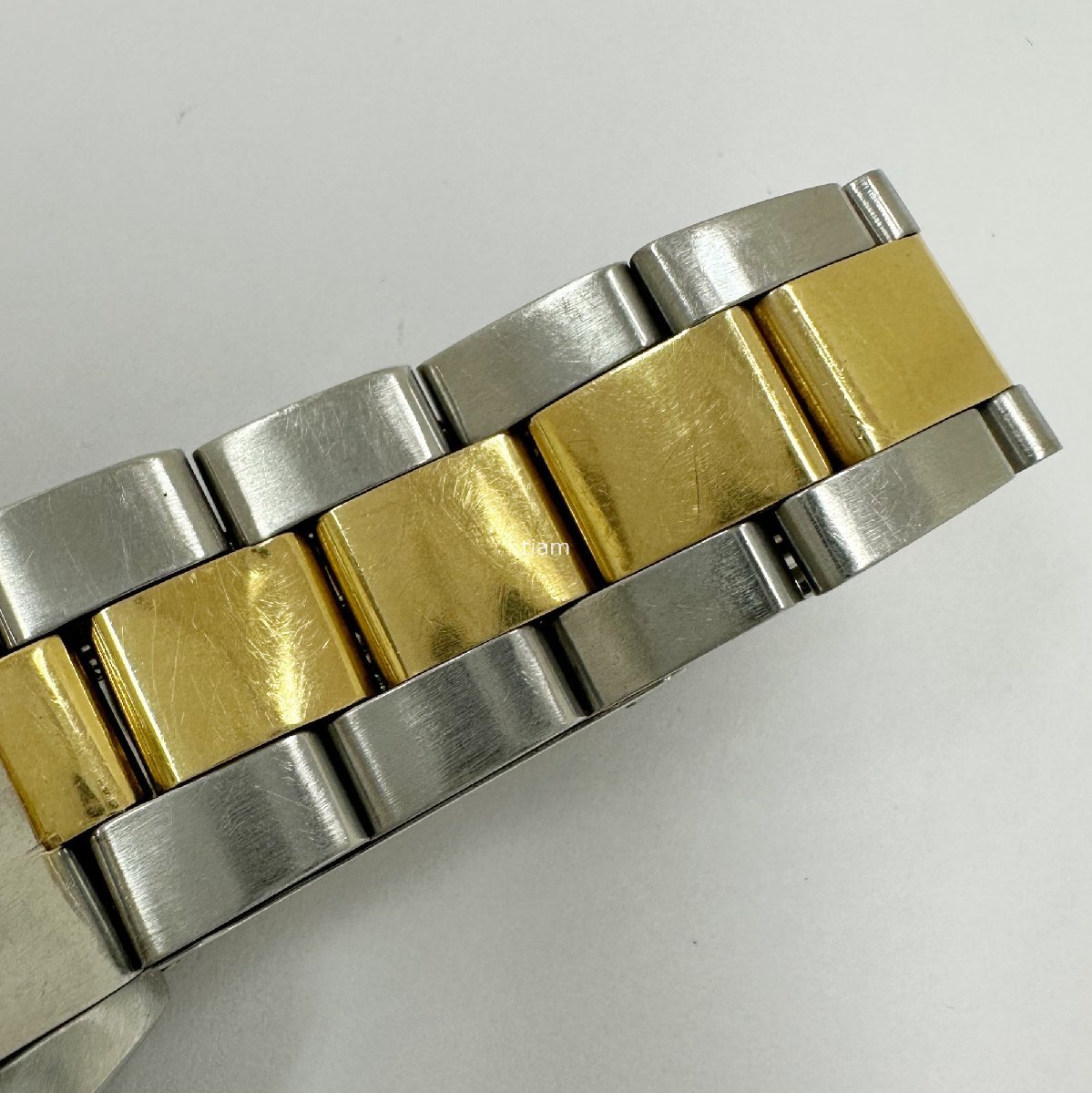 ガラス: 表面に傷がございます。 ダイヤル/針: 汚れ、シミがあり夜光が落ちています。針と王冠に変色がございます。 ケース/ベゼル: 小傷が多くございます。 ブレス: ヨレがございます。 その他: 裏蓋に刻印がございます。 | ||