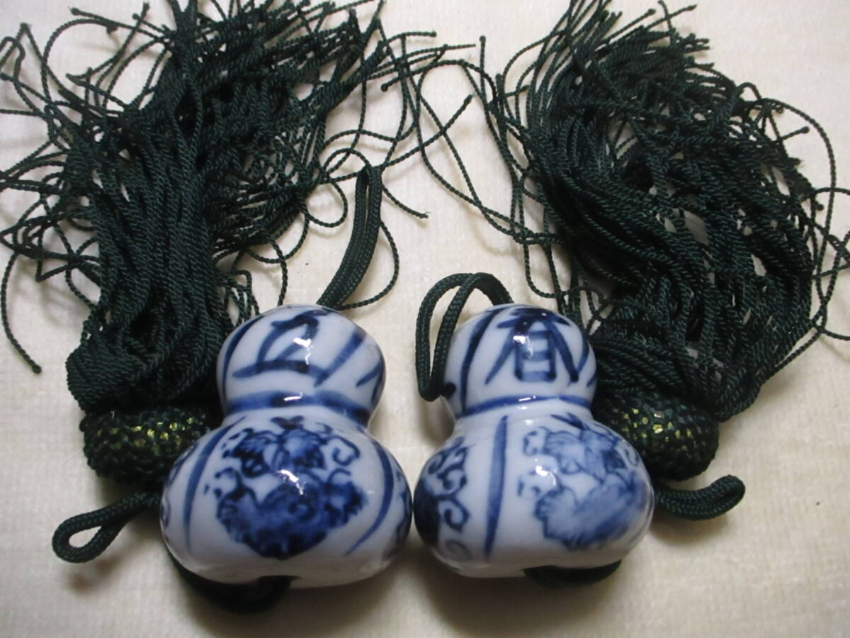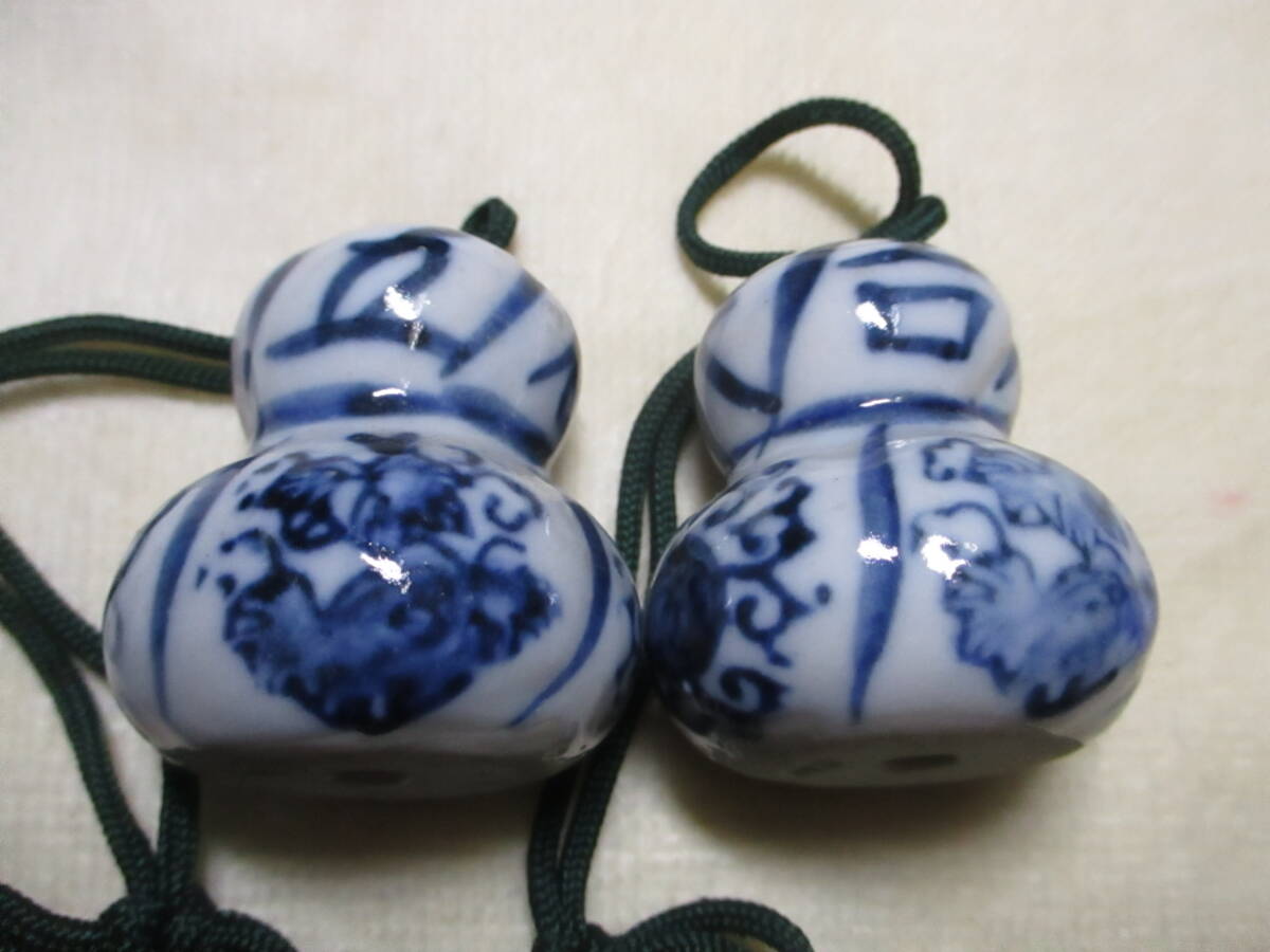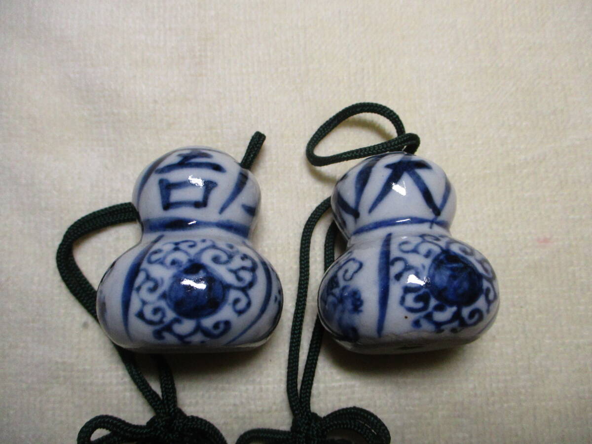 江戸時代の蔵から★立春大吉 染付 瓢箪形 ひょうたん 陶磁 九谷焼 風鎮 1対 4.5cm 164g 掛け軸道具★R