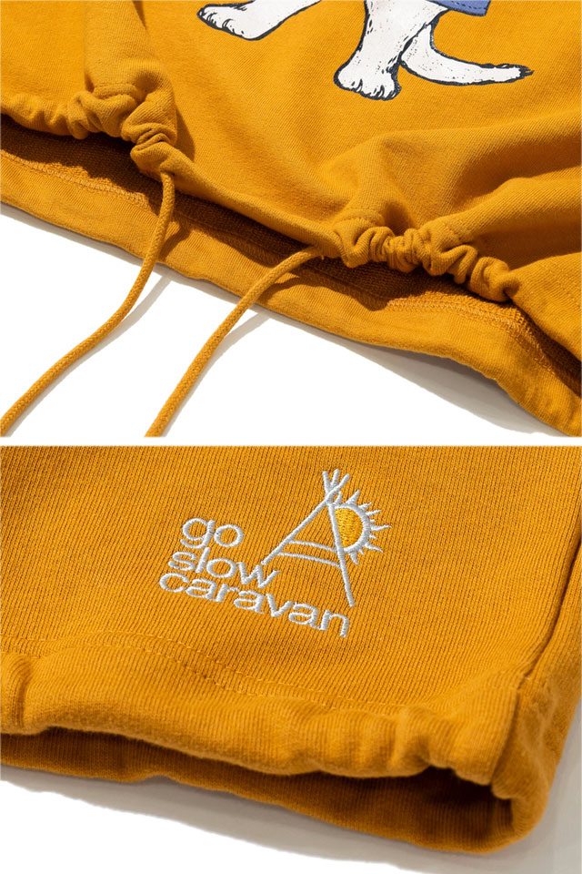 旅行やフェス、キャンプ、サーフィン、サイクリングなど、外遊び好きの仲間が集まってはじめたブランド【go slow caravan】より「空紡糸裏毛 スキレットピザ猫 ヘムスピンドルフーディー(352607)」のご紹介です。 go slow caravanオリジナルで編み立てている空紡糸裏毛シリーズから、人気の「猫」スピンドルフーディーが登場しました! 裾口をスピンドル仕様にしたベーシックシルエットのフーディーです。 リブ裾タイプに比べてインナーに重ねてもゴワつきにくく、絞ることでシルエットのアレンジもお楽しみいただけます。 フロントには、スキレットで焼いたピザを頬張る「キャンパー猫」をプリント。 黒インク部分にはジェルプリントを重ね、立体感のある多色ラバープリントで表現しました。 愛嬌と遊び心を詰め込んだ1枚です。 《空紡糸裏毛/HEAVY WEIGHT》 表は空紡糸らしいガシッとした肌触りでありながら、裏のパイル面には太い裏糸を使用しているため、空気を多く含みフワッと柔らかい着心地を実現しました。 使い込むほどに風合いの増す生地。 クラシック感のある長めのリブや3本針で丈夫な縫製など、こだわりのディテールも取り入れた長くご愛用いただけるアイテムです。 | ||||||||||||||||||||