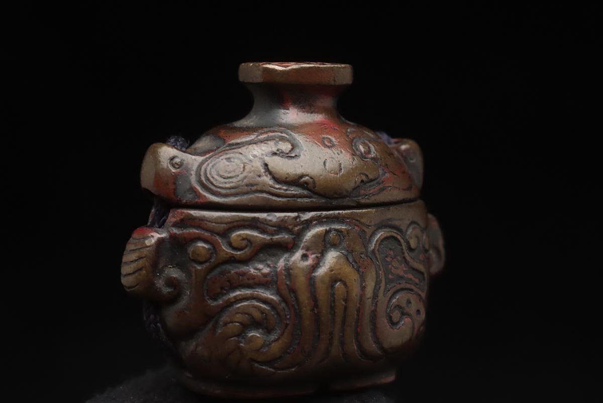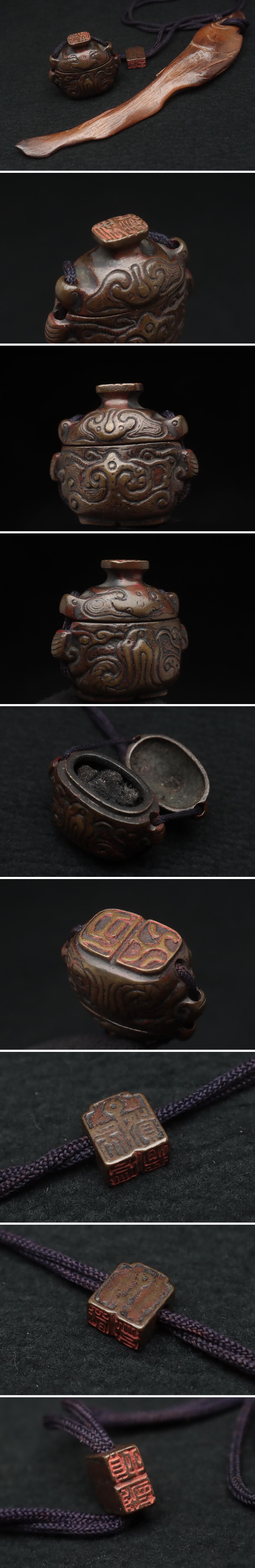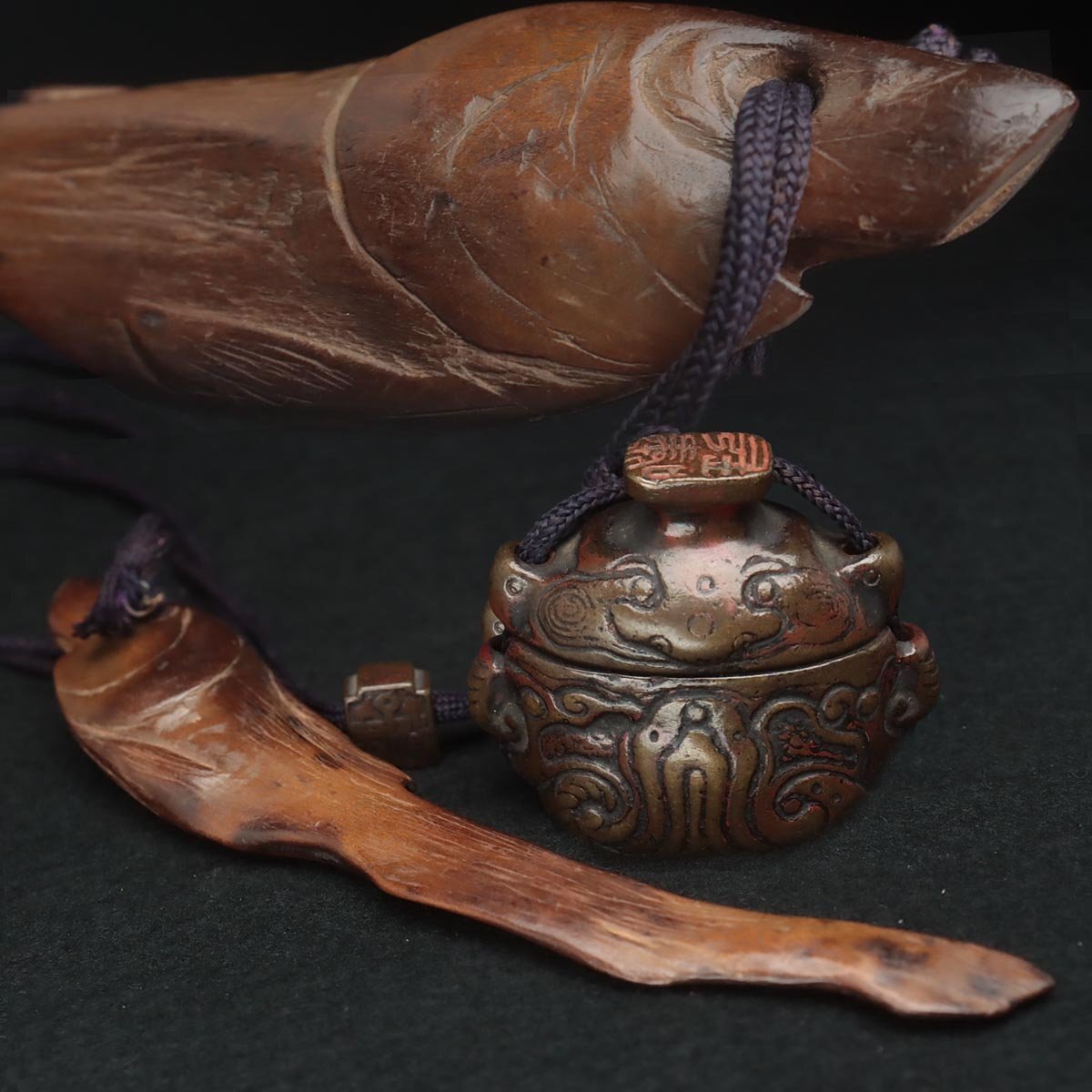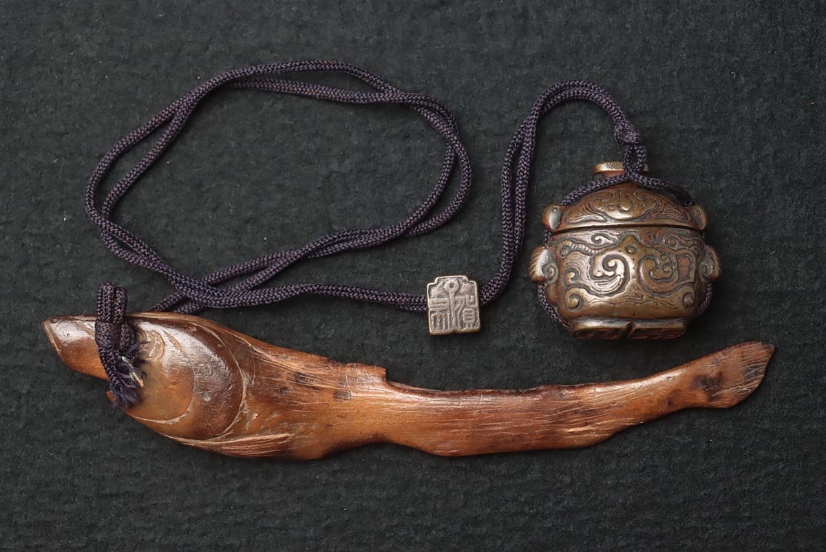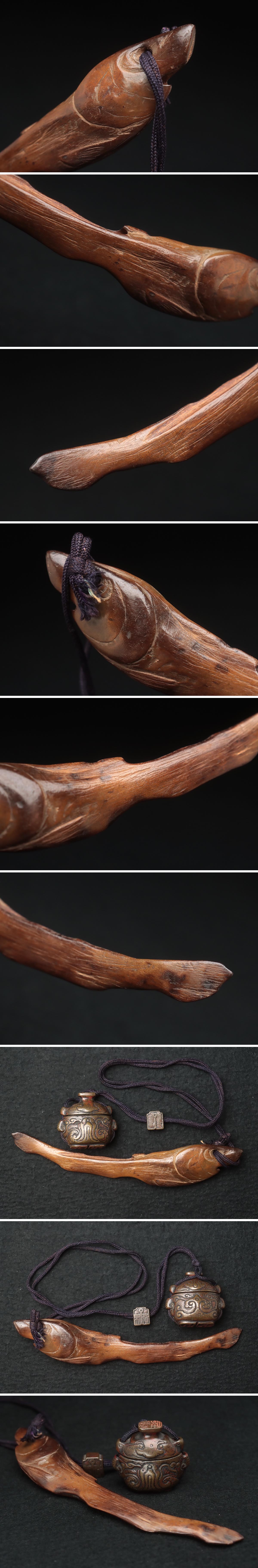 ◆ 時代提げ物 天然木根 魚根付/古銅饕餮紋墨入 印材付・樹根雕魚吊墜 銅墨盒和印章 携帯書道具 古美術品 ◆
