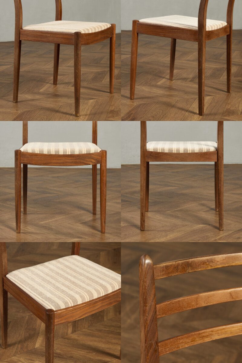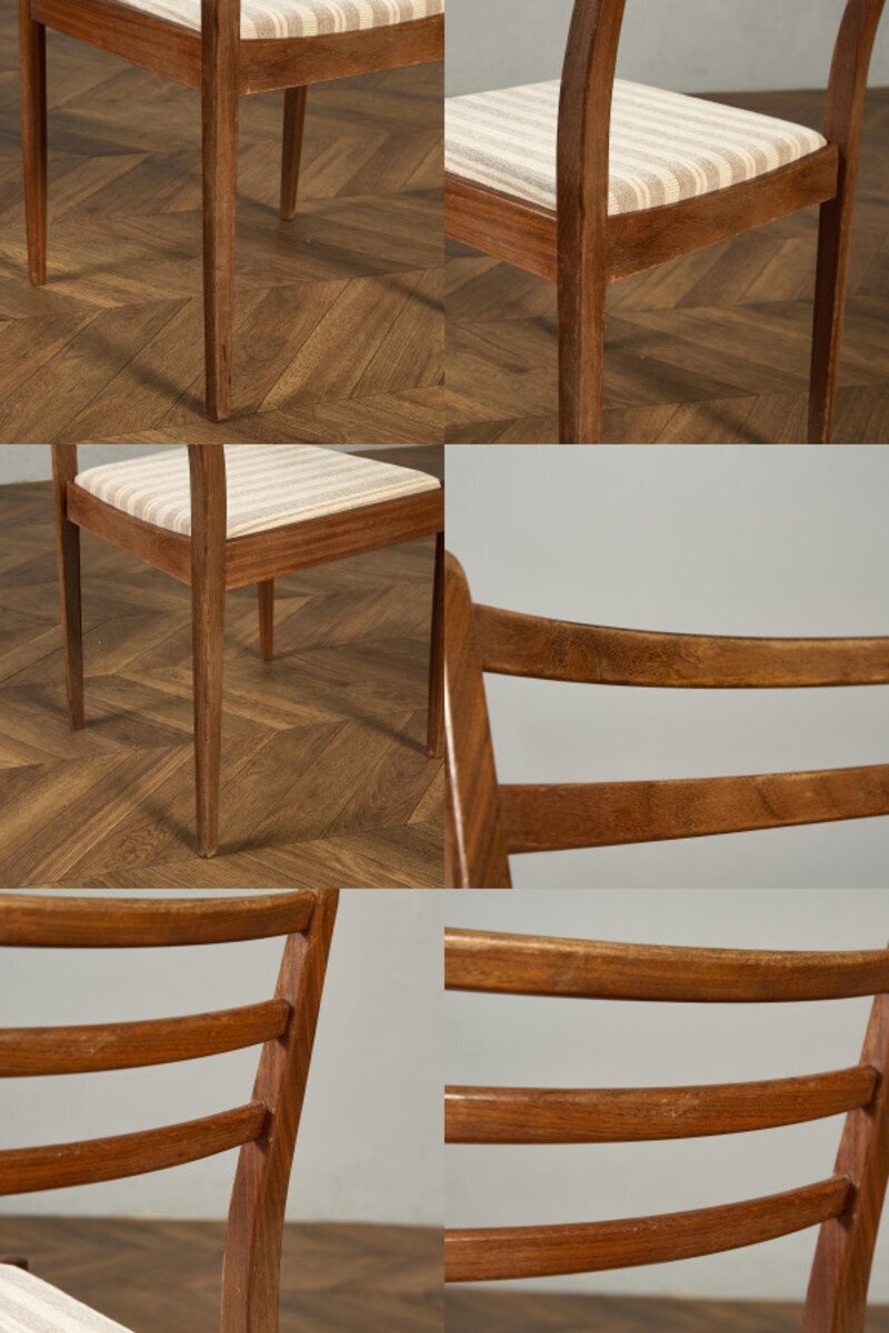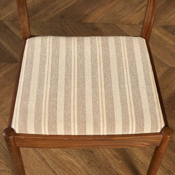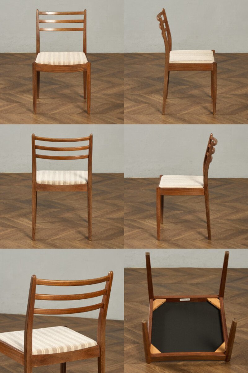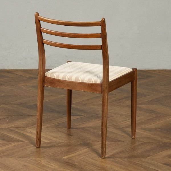 イギリスにおいてミッドセンチュリーを代表するブランド G-PLAN(ジープラン) による、Fresco(フレスコ) シリーズ ダイニングチェア 座面張替え済みです。 スカンジナビアのデザイン様式からインスパイアされたダイニングチェア。3本の背もたれラダーが特徴的で、緩めのカーブが繊細さを感じさせつつも、シャープな印象になりすぎない独特の魅力があるチェアです。 約50年前に英国で一世を風靡したG-PLANの中でも最も売れたシリーズと言われている「フレスコシリーズ」1960年のDanishシリーズに続き、発表当初のデザインは Ib Kofod-Larsenが手がけ、後にWilkins Victor Bramwellが引き継ぎました。チーク材などを用いた北欧色の強いデザインとなっており、現代においてもGプランを象徴する最も人気の高いシリーズです。 |