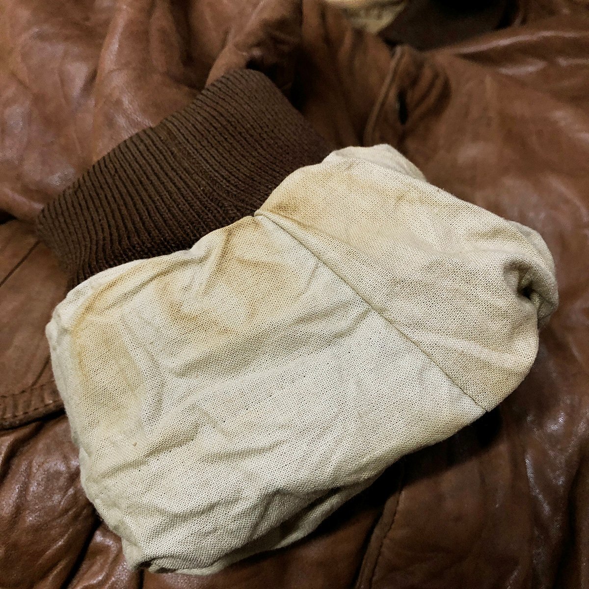 中古品です。使用感があります。両腕や背面などボディの所々に経年による擦れや変色や小さな傷、裏地首周りや両袖先など所々に汚れがあります。