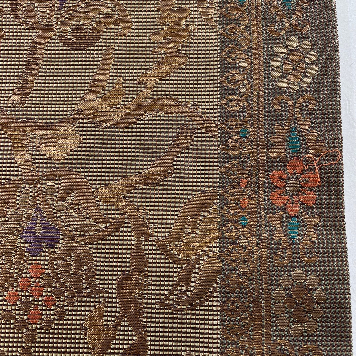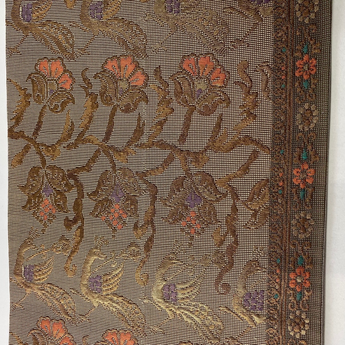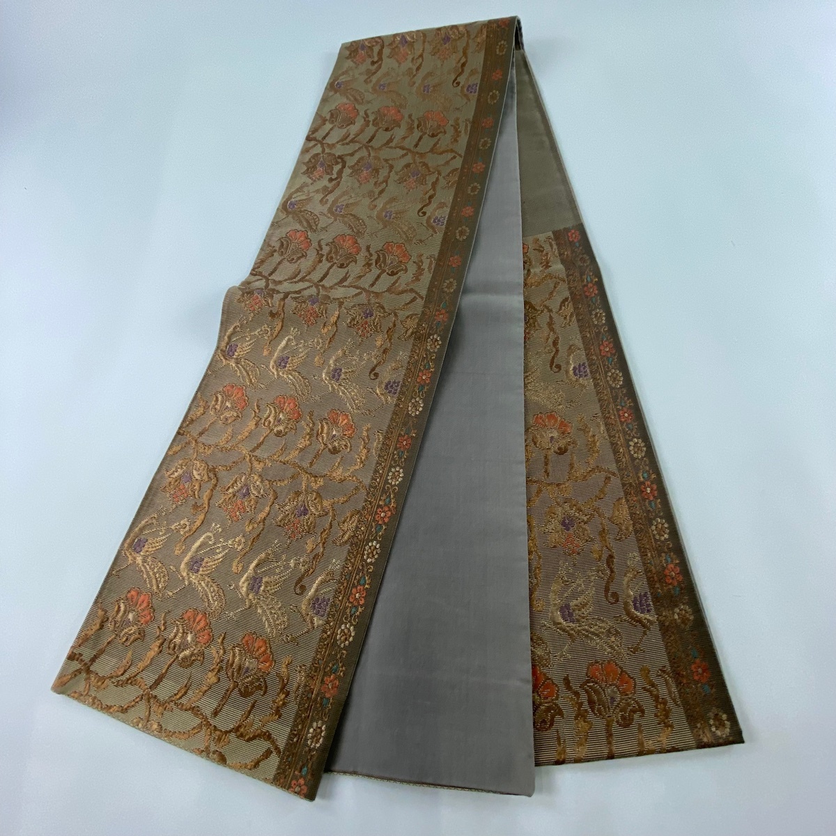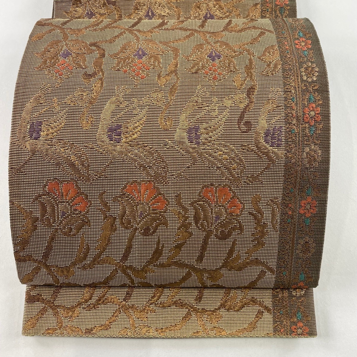 | 袋帯 秀品 鳥 草花 箔 金糸 茶色 六通 正絹 【中古】 |