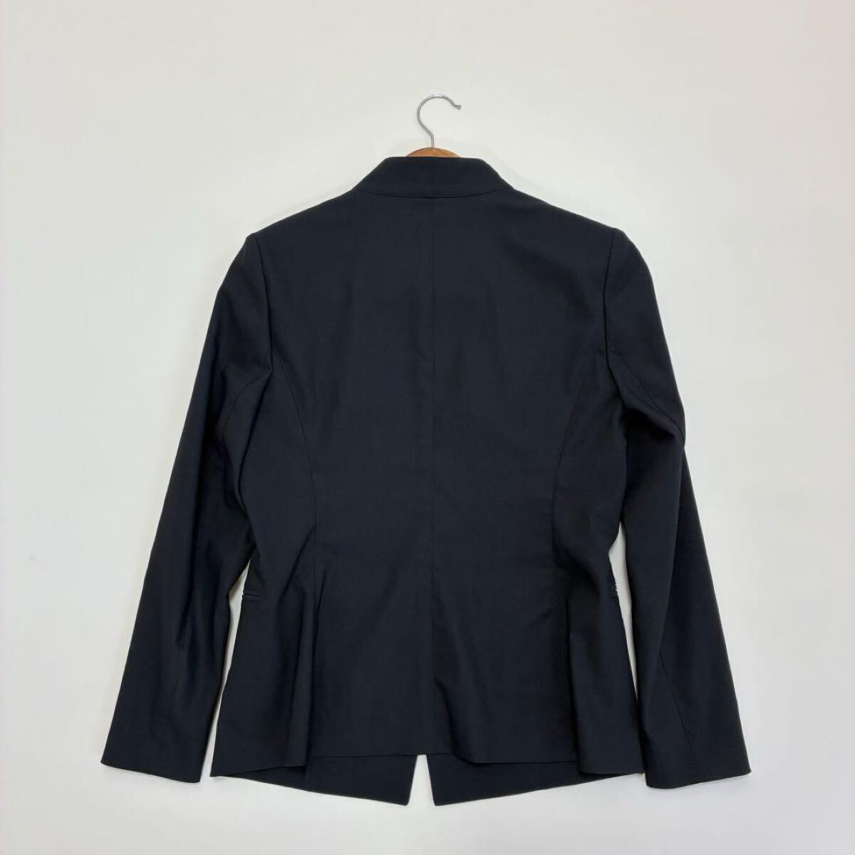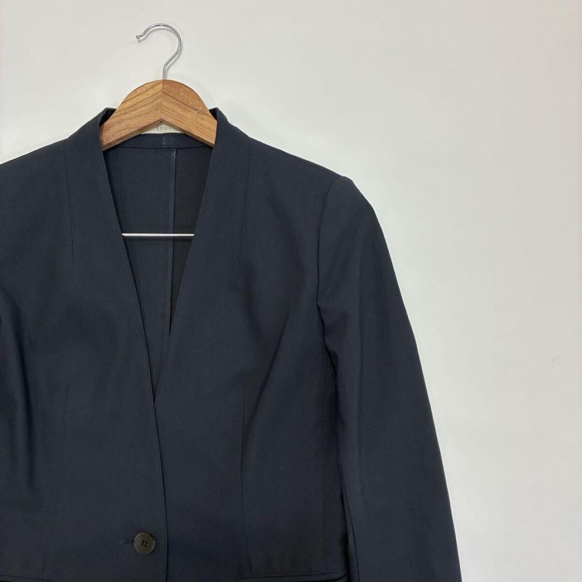 ノーカラーなのでブラウスやワンピースとの相性も抜群。夏の通勤スタイルに、きちんと感と快適さを両立する一着です。