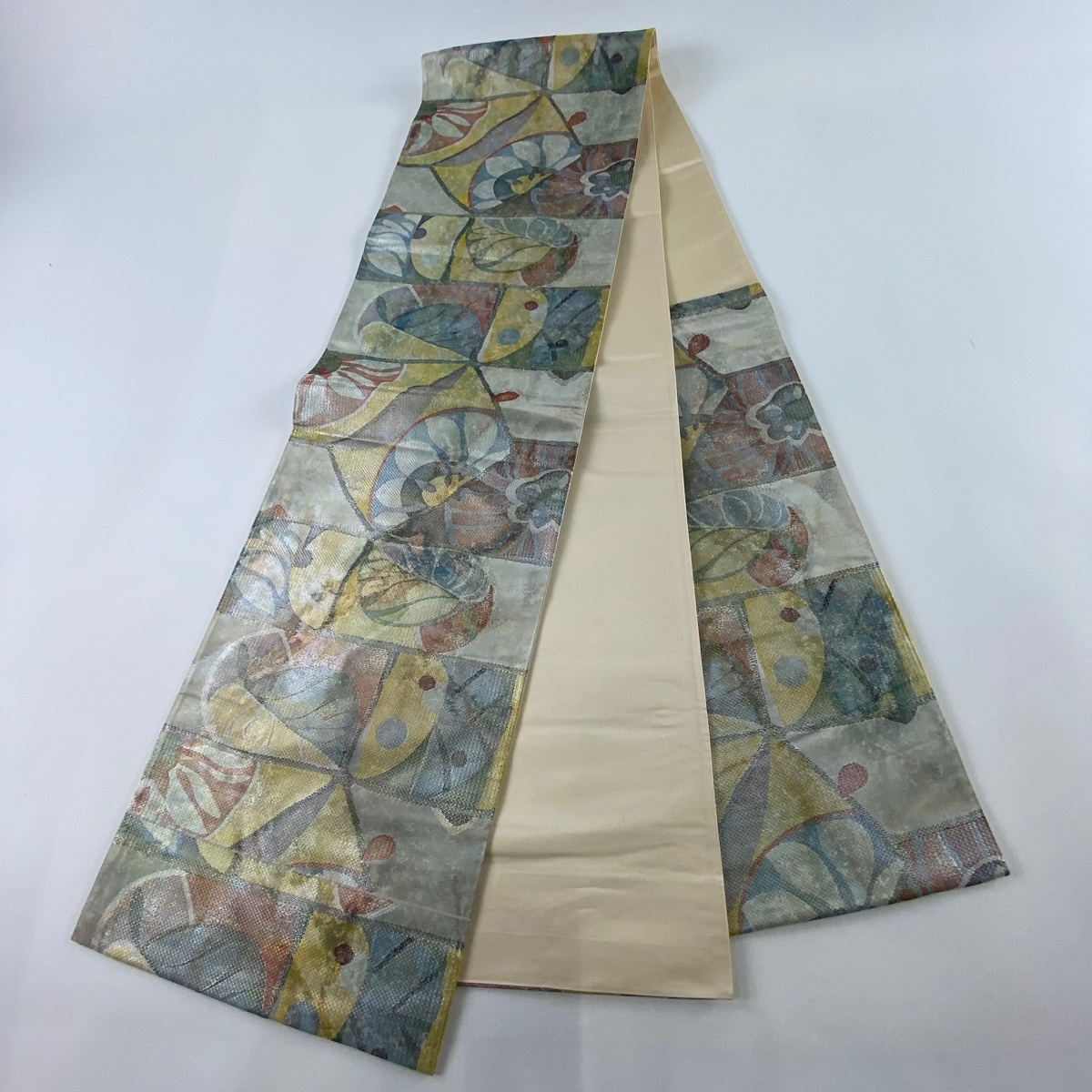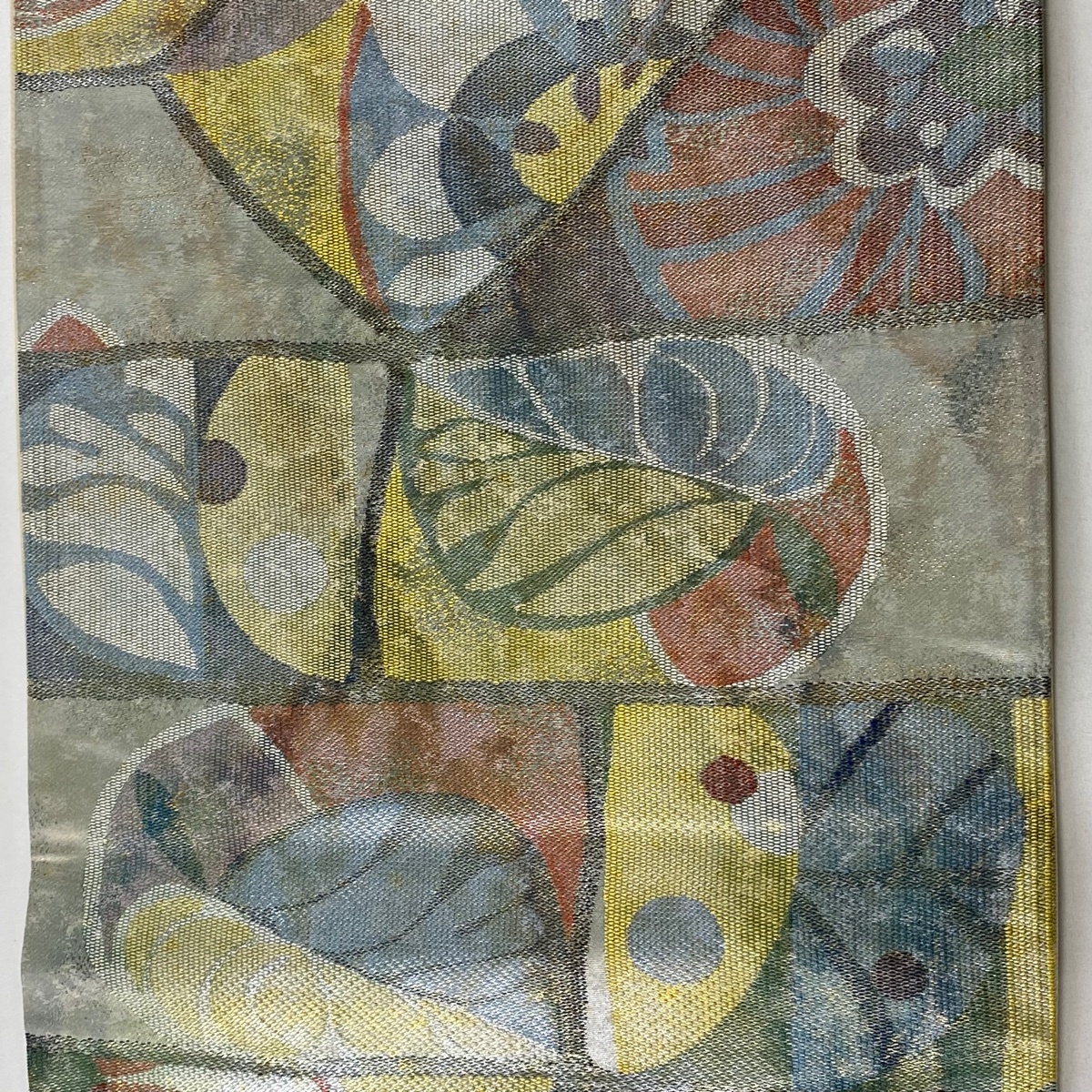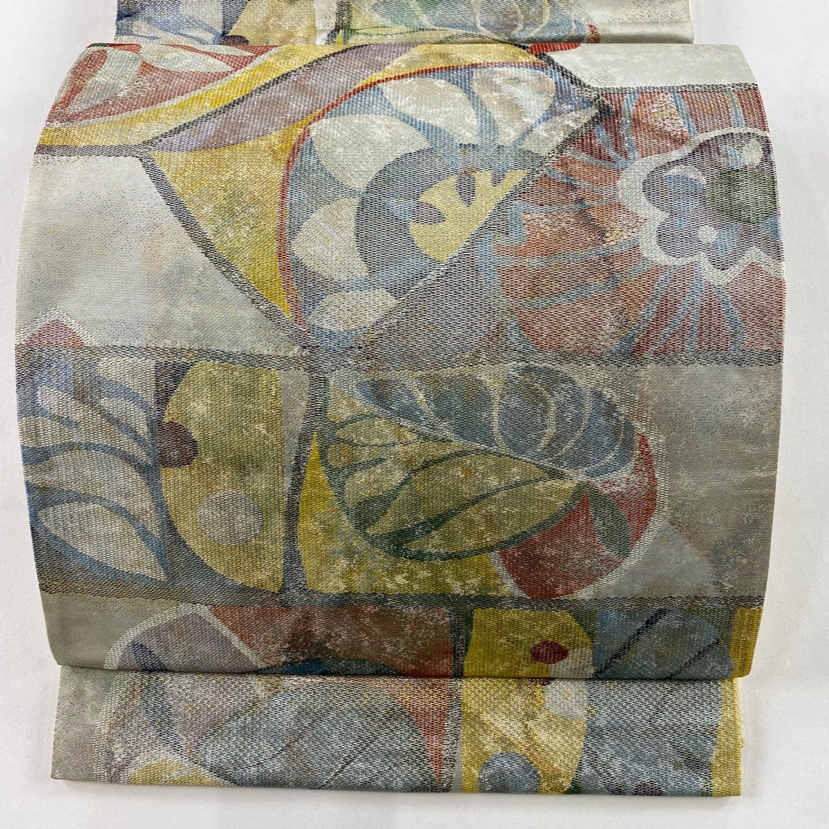 | 袋帯 美品 秀品 花柄 幾何学模様 箔 灰緑 六通 正絹 【中古】 |
