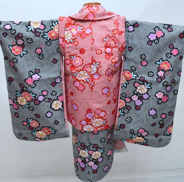 | サイズ | ■着物 被布丈約48cm 裄丈約42cm(2cmの上げ、4cmのばすことが可能) 袖丈約57cm 着物丈約76cm(7cmの上げ、14cmのばすことが可能) ■草履:18cm(フリーサイズ) 適合身長83cm~105cm ※身長87cm~96cmであれば特に直さずともこのままでご着用いただけるかと思います ※着丈=背中首のゴリゴリ部分から、足くるぶしまでの長さ ※裄丈=腕を斜め45度下げた状態で、背中首ゴリゴリ部分から、肩上を通して、手くるぶしまでの長さ ※はじめから肩上げ、腰上げがとられているので解いて数センチ伸ばす(丈出し)ことも可能です。 ※タグには、「身丈約90cm、袖丈約57cm、裄丈約46cm」と明記しておりますが、当店で実際に計測したサイズは、 上記サイズでございます。タグ表示は上げをしていない状態でのサイズ表示と思われます。 |