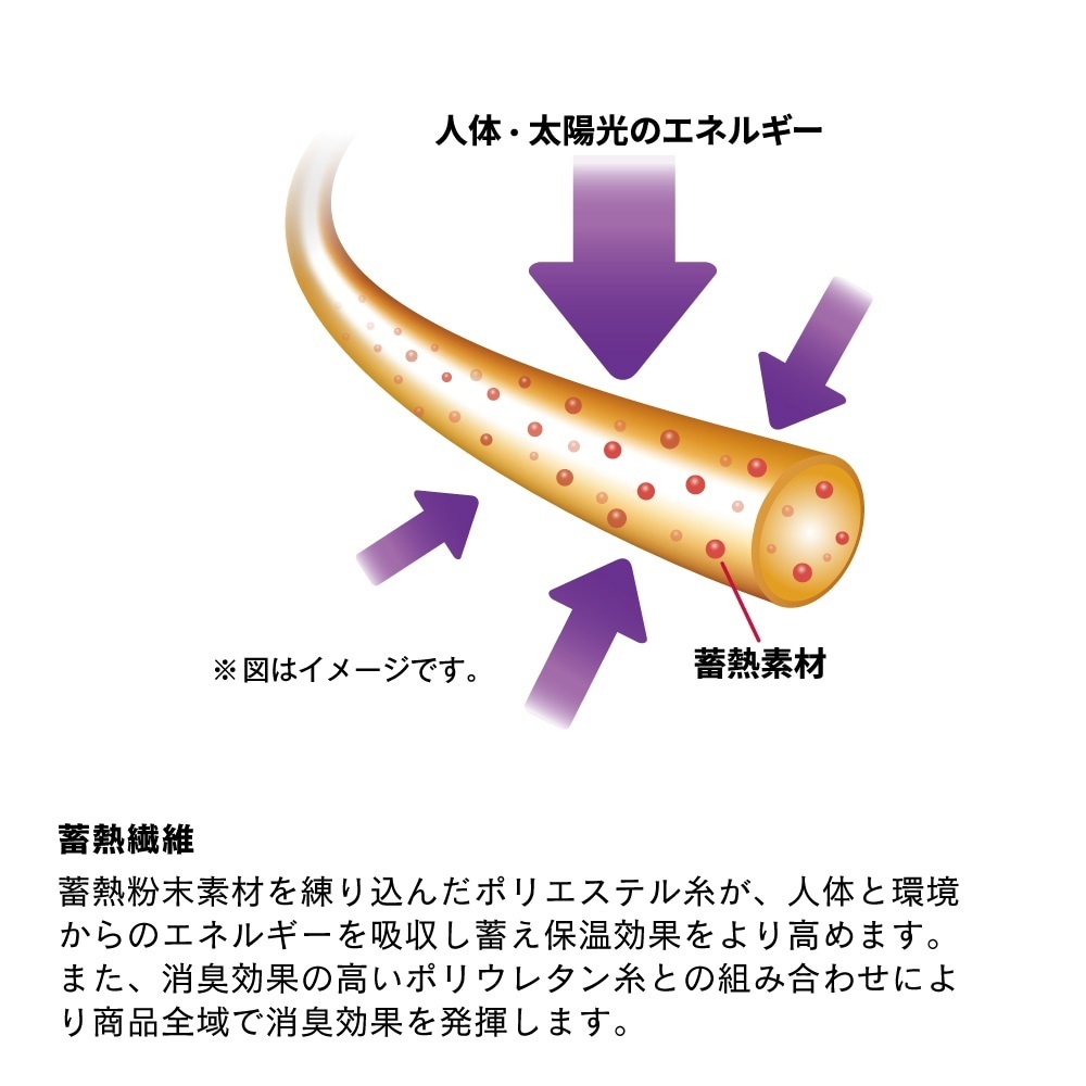 蓄熱粉末素材を練り込んだポリエステル糸が、人体と環境からのエネルギーを吸収し蓄え保温効果をより高めます。