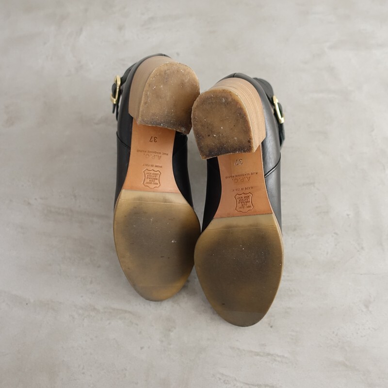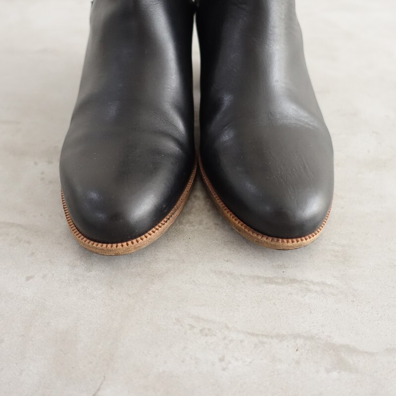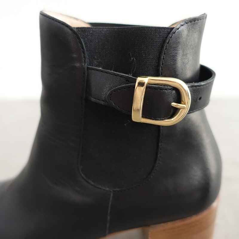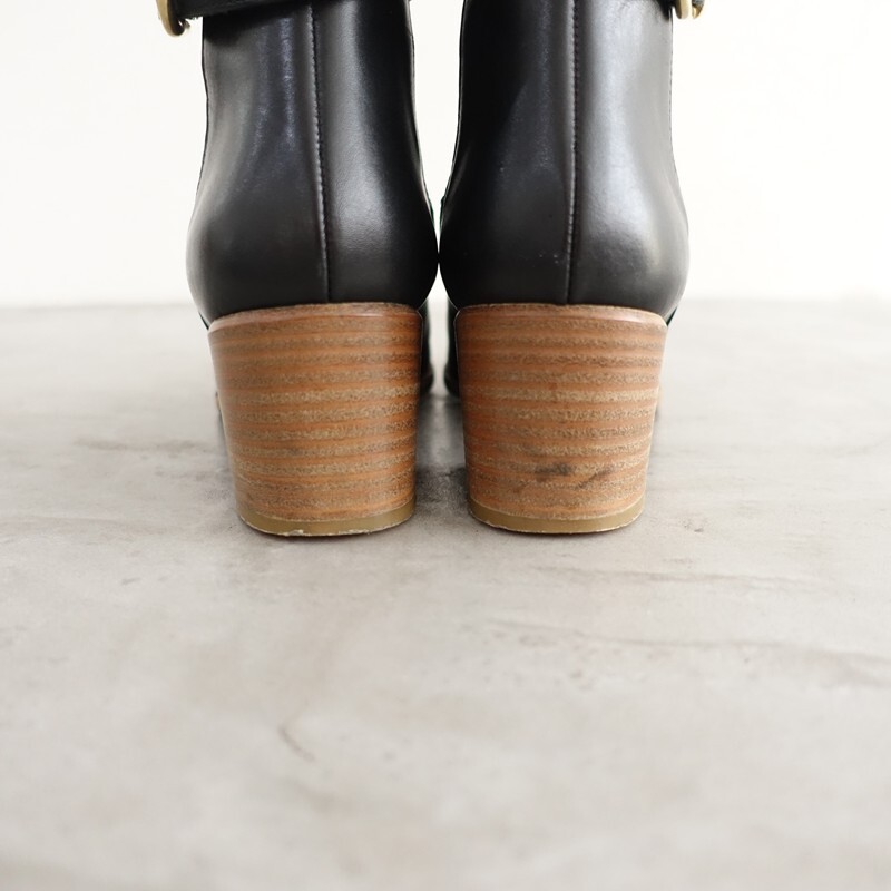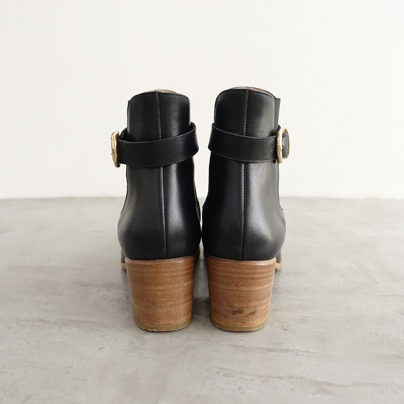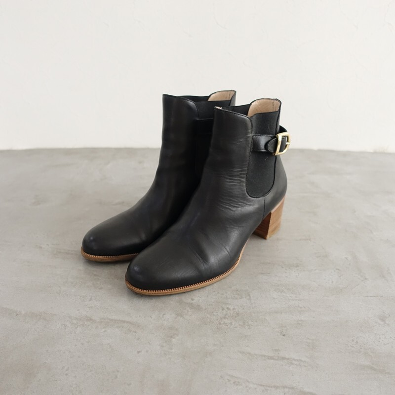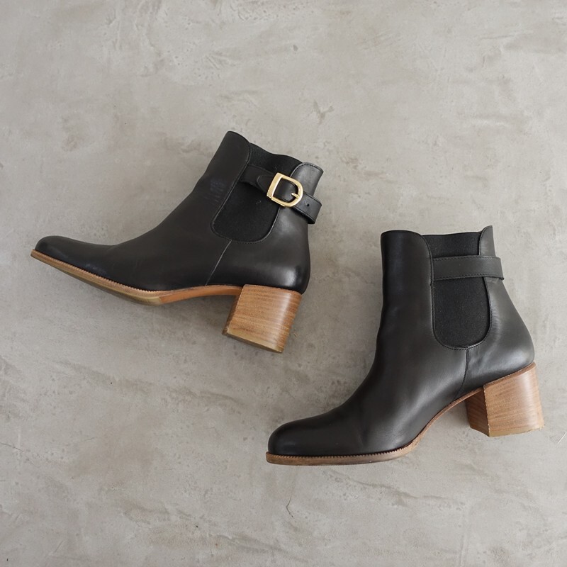 | A.P.C.のサイドゴアショートブーツです。カラーは黒で素材はレザー、サイドゴアで着脱しやすくなっており、サイドからバックにかけて3段階に調節可能なベルト付きです。 |