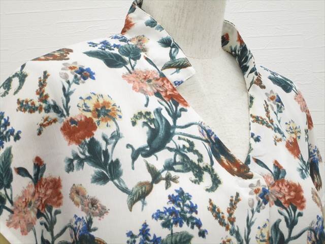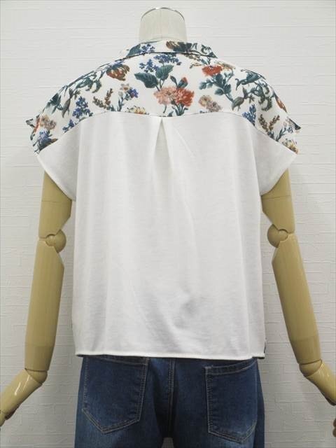 半袖 スキッパーネック カットソー M ホワイト地 ブルー×ブラウン×グリーン 花柄 【メール便可】