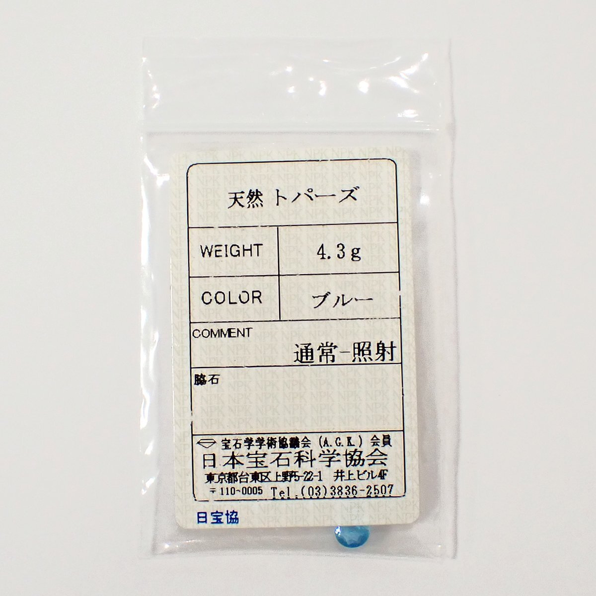 | 商品状態【目立った傷や汚れなし】の天然トパーズです。 日宝協(日本宝石科学協会)のソーティング付のルースです。 美しいブルートパーズです。 | |