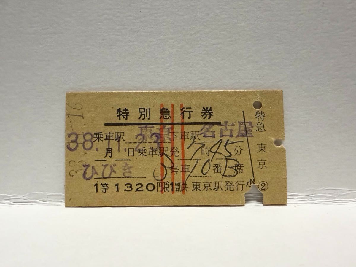 【切符/硬券】特別急行券 東京 → 名古屋 東京駅発行 ひびき S38 @h