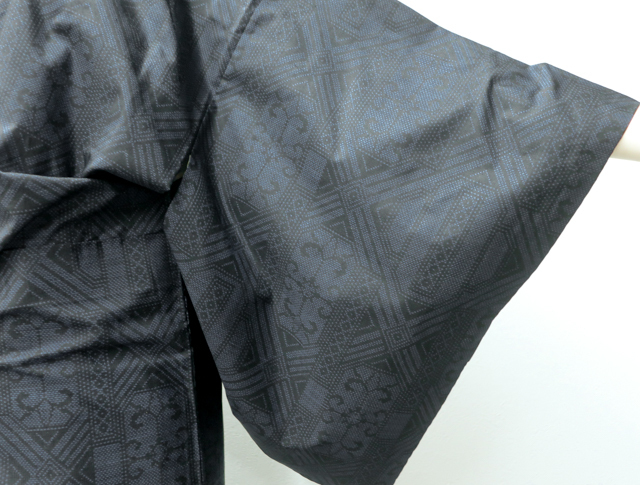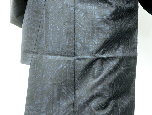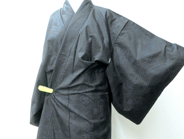 リサイクル商品のため、胴裏や衿裏にスナップボタンによる汚れがございますが着用可能なお品です。 地色は、藍色です。 1枚目の画像が近いお色かと思われます。 素材は正絹です。 |