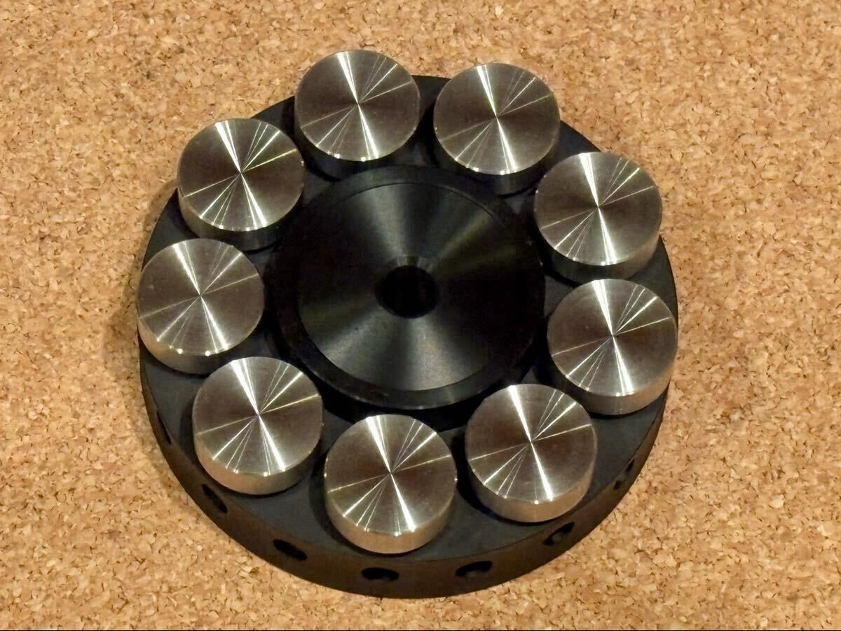 SVM機構とは、9個のステンレス製のセパレートウエイトを搭載するその構造に特徴があり、レコードの盤面の微細なそりに応じてそれぞれのウエイトが最適な荷重を与えるため、レコード盤全体をフラットに保ち、効果的に振動を抑制することができます。またこうした方法を用いることで、カートリッジの針先がレコード溝をトレースする際、針先に与える余計な振動から解放され、音溝に刻まれた信号を余すことなくピックアップすることが可能になります