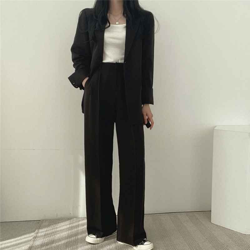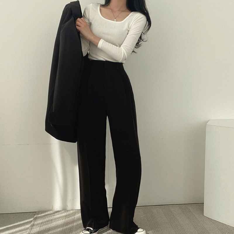 タック入りのワイドパンツでカジュアルさもありつつ、キチンと感もアップ。