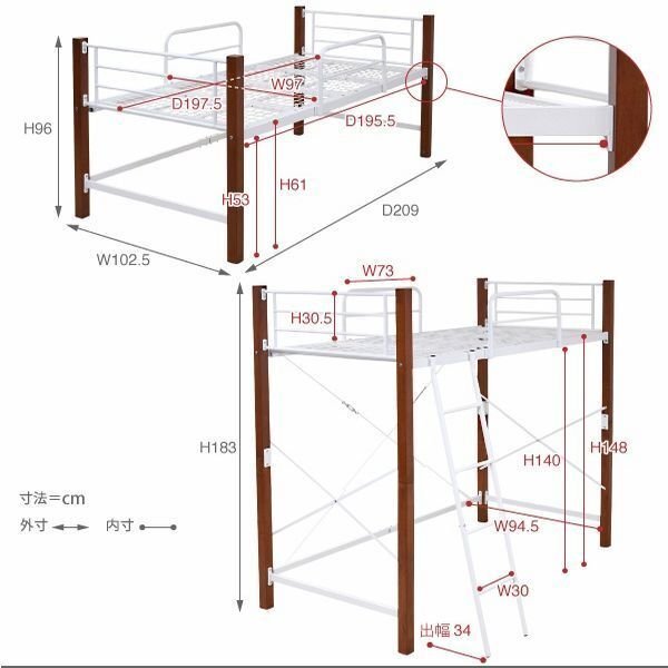 【カラー】 ブラック×ブラウン、ホワイト×ブラウン、ホワイト×ナチュラル、ブラック×ナチュラル 【サイズ】 <外寸> 幅102.5×奥行209×高さ183cm <内寸> (共通) 床面:幅97×奥行197.5cm サイドガード:幅73×高さ30.5cm (ミドルタイプ) 床面高さ:高さ61cm 床面下:幅94.5×奥行195.5×高さ53cm (ロフトタイプ) 床面高さ:高さ148cm 床面下:幅94.5×奥行195.5×高さ140cm はしご出幅:34cm 【材質】 フレーム:スチール(粉体塗装) 支柱:ラバーウッド(ラッカー塗装) 【耐荷重】 床面:120kg以下 【生産国】 マレーシア 【梱包】3梱包でお届けします。 3-1 サイズ:103×40×14.5cm、重量:23.5kg 3-2 サイズ:95.5×46×16cm、重量:13kg 3-3 サイズ:92.5×40.5×14cm、重量:13.5kg 【その他】 ・ミドル/ロフト組み替え可能 ・六角レンチ、スパナ同梱 ・支柱は天然木を使用しているため、商品によって色味や木目などの風合いが異なります。 【組み立て品】 お客様による組み立てが必要です。 【ご注意】 ・サイズ、重量は概算です。 ・商品カラーはご使用のモニターによって実際の明るさや色と異なって見える場合がございます。 |