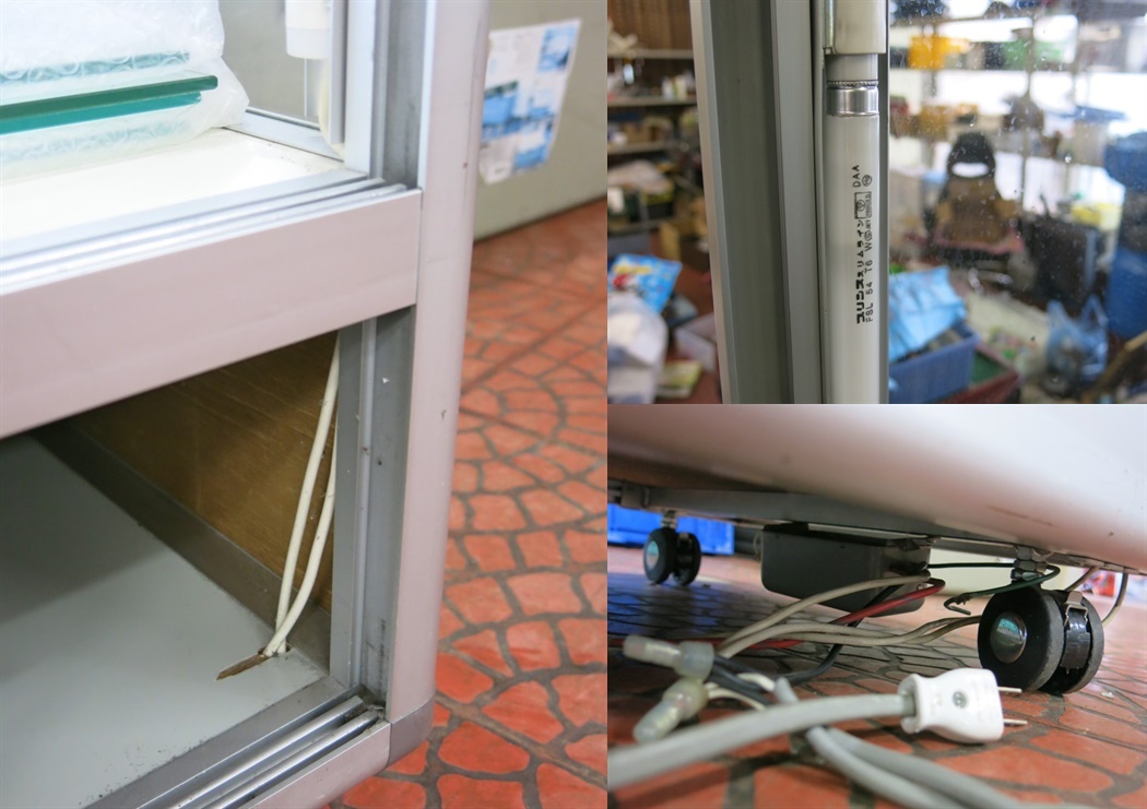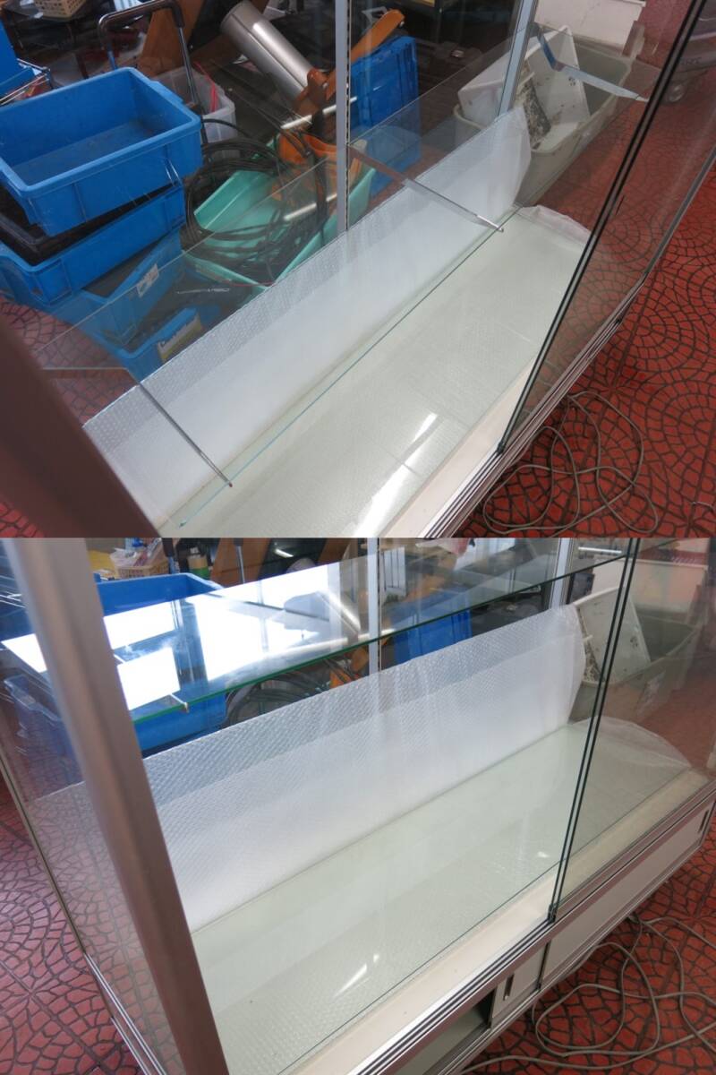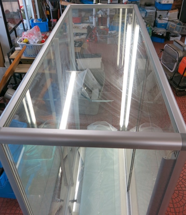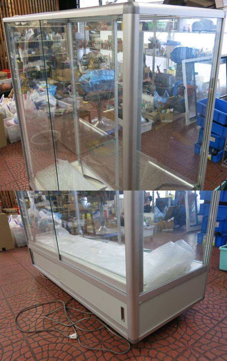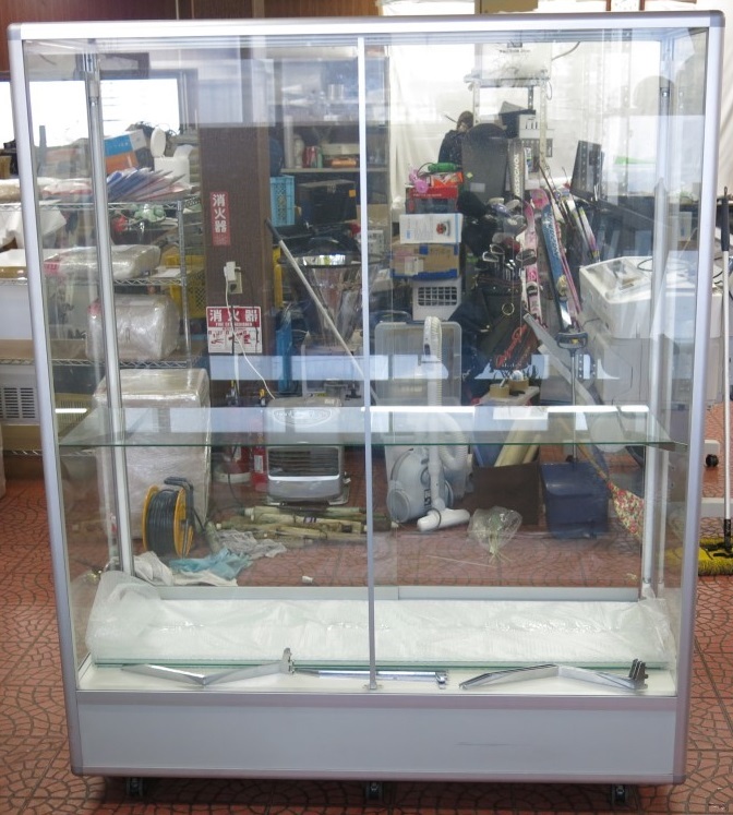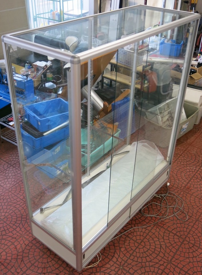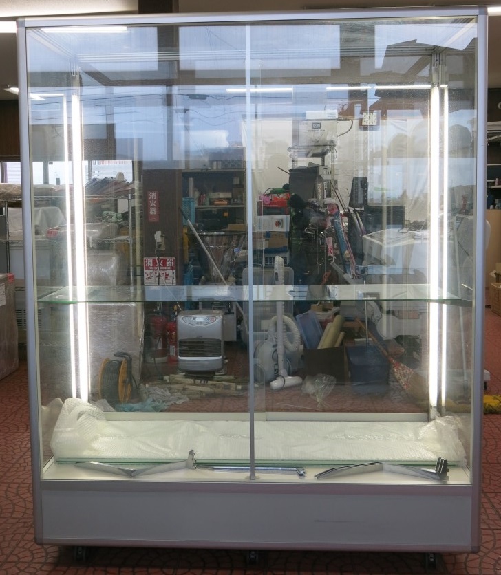 11K804 引き取りのみ[北海道白老町] 大型 ガラスショーケース [幅 150 × 60 ・高さ184cm] 改造照明付き キャスター有 現状