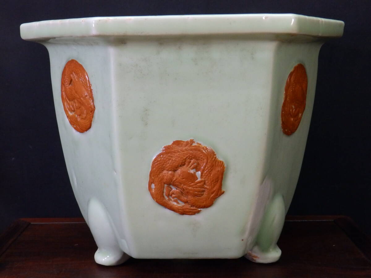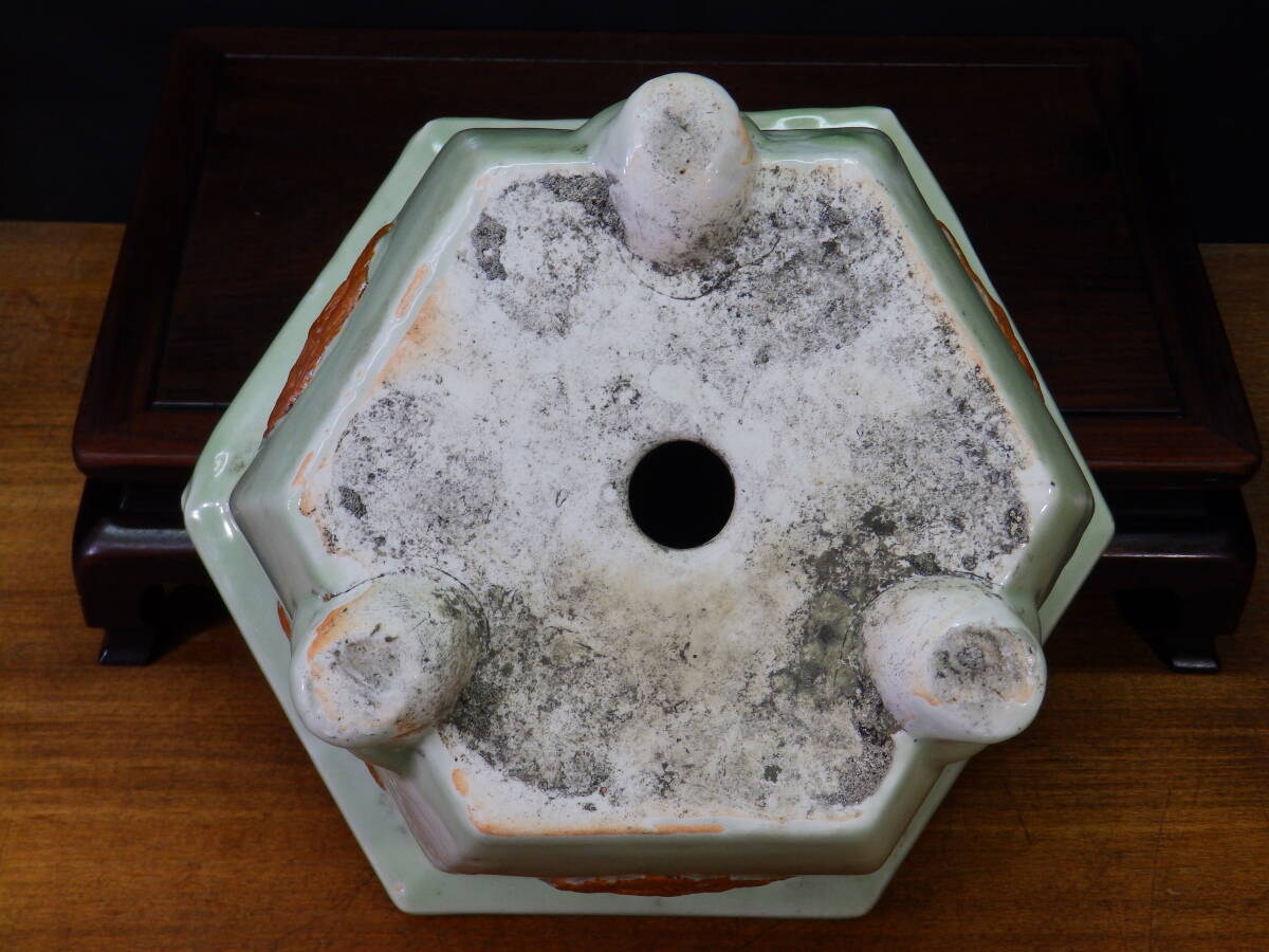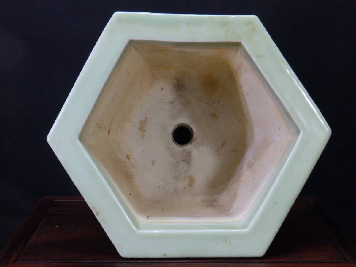 ★盆栽日和★ 和鉢 【瀬戸・尾張焼】 青磁釉外縁浮絵龍図模様入六角鉢 34.7㎝ (k)