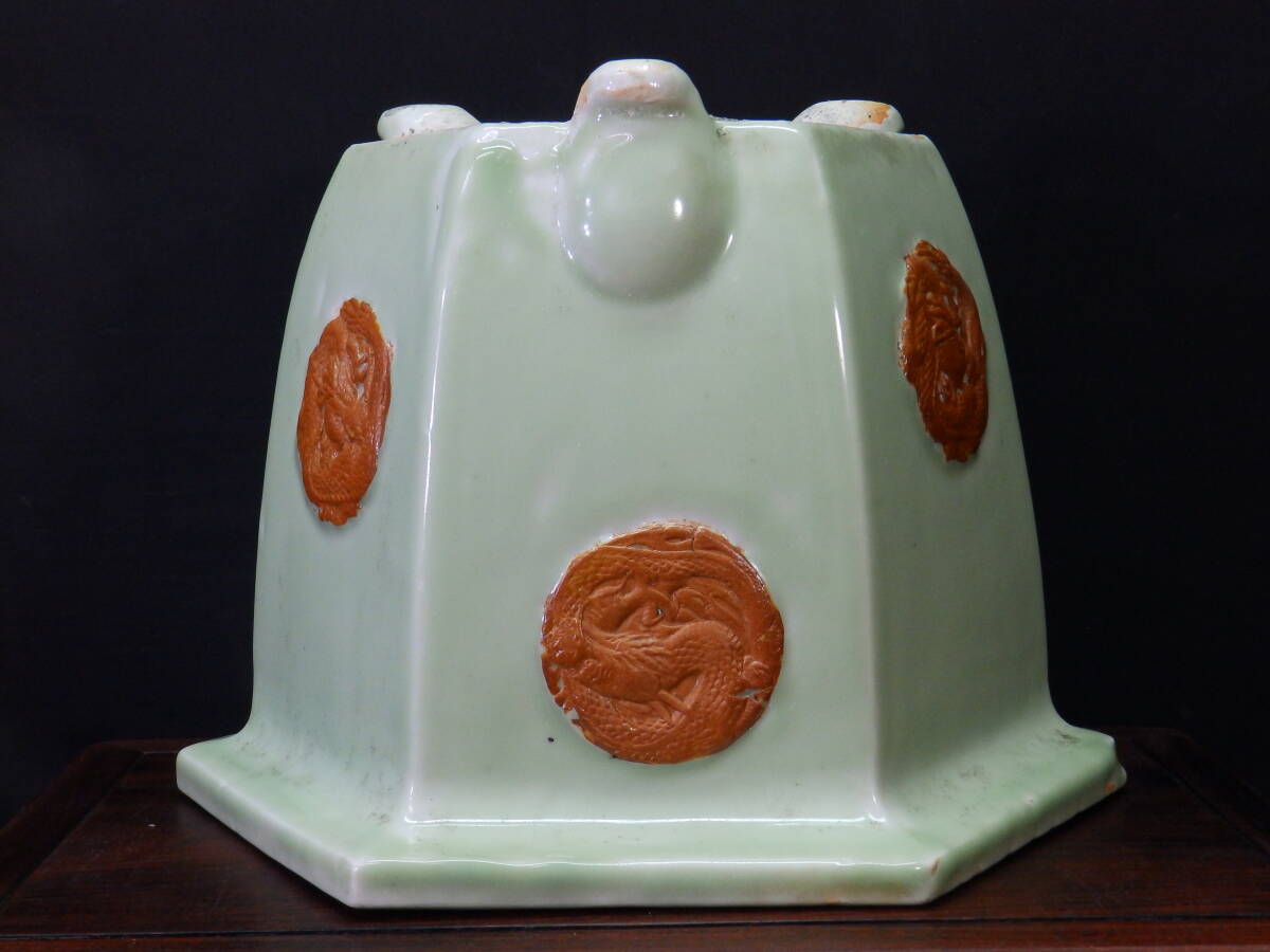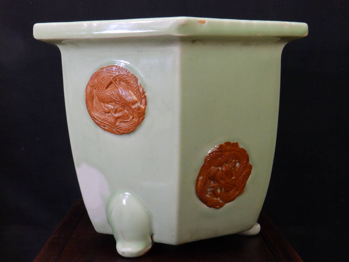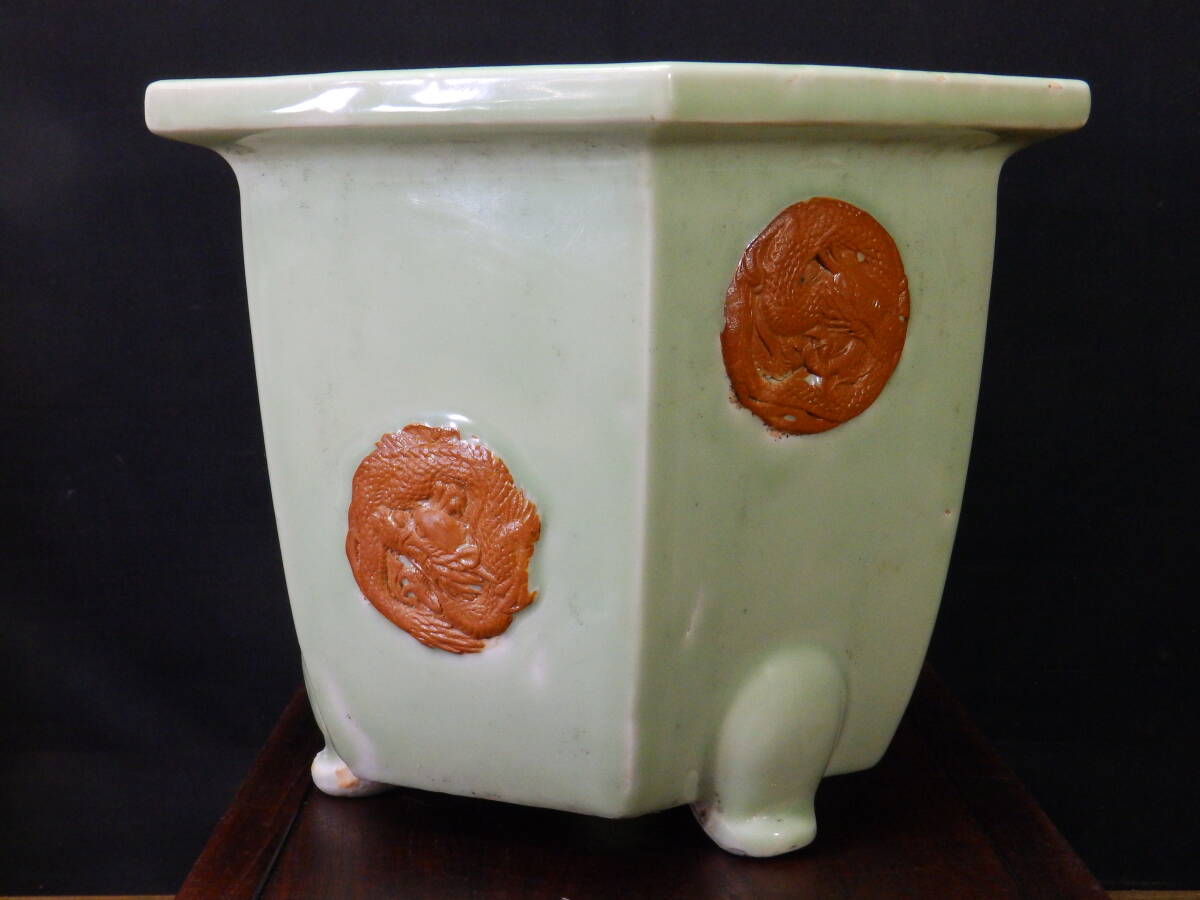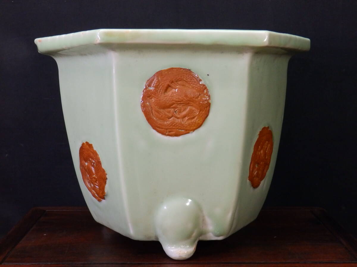 ★盆栽日和★ 和鉢 【瀬戸・尾張焼】 青磁釉外縁浮絵龍図模様入六角鉢 34.7㎝ (k)