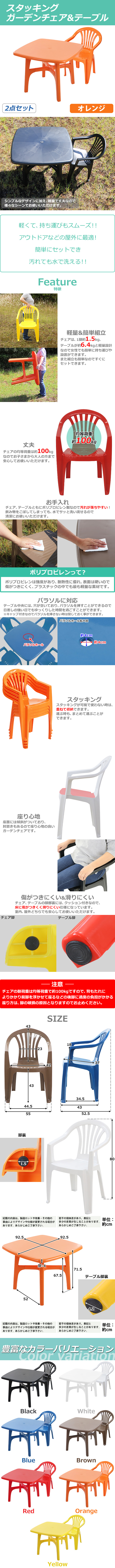 ●ガーデンチェアは、スタッキング構造なので重ねる事が可能なので、収納やまとめて運ぶ際にも大変便利です。 ●テーブル中央にパラソルなど、設置可能な穴があります。 ●テーブルは、簡単な組み立て式になります。チェアは、完成品です。 ●チェアは1脚約1.5kg、テーブルは約6.4kgと軽量なので、女性でも軽々持ち運べます。 ●材質は、軽量、安全、防水のポリプロピレン(PP)です。 注意! 背もたれによりかかり前脚を浮かせて座るなどの後脚に過度の負担がかかる座り方は脚の破損の原因となりますのでお止めください。 ■重量(チェア):約1.5kg ■耐荷重(チェア):約100kg ■重量(テーブル):約6.4kg ■耐荷重(テーブル):約100kg ■材質:PP[ポリプロピレン](チェア、テーブル)、ゴム(チェア脚裏)、PVC(テーブル脚裏) ●商品のカラーはオレンジとなります。 ●新品商品ではありますが、輸入商品の為、多少の擦り傷などがある場合がございますので、ご納得の上ご購入下さいませ。 ●ご購入後、お客様ご都合によるご返品、ご返金等は一切お受け致しておりません。 ●本商品を使用した際に発生したトラブル、事故につきまして、当社は一切の責任を負いません。ご使用に関しましては、全て自己責任にてお願い致します。 |