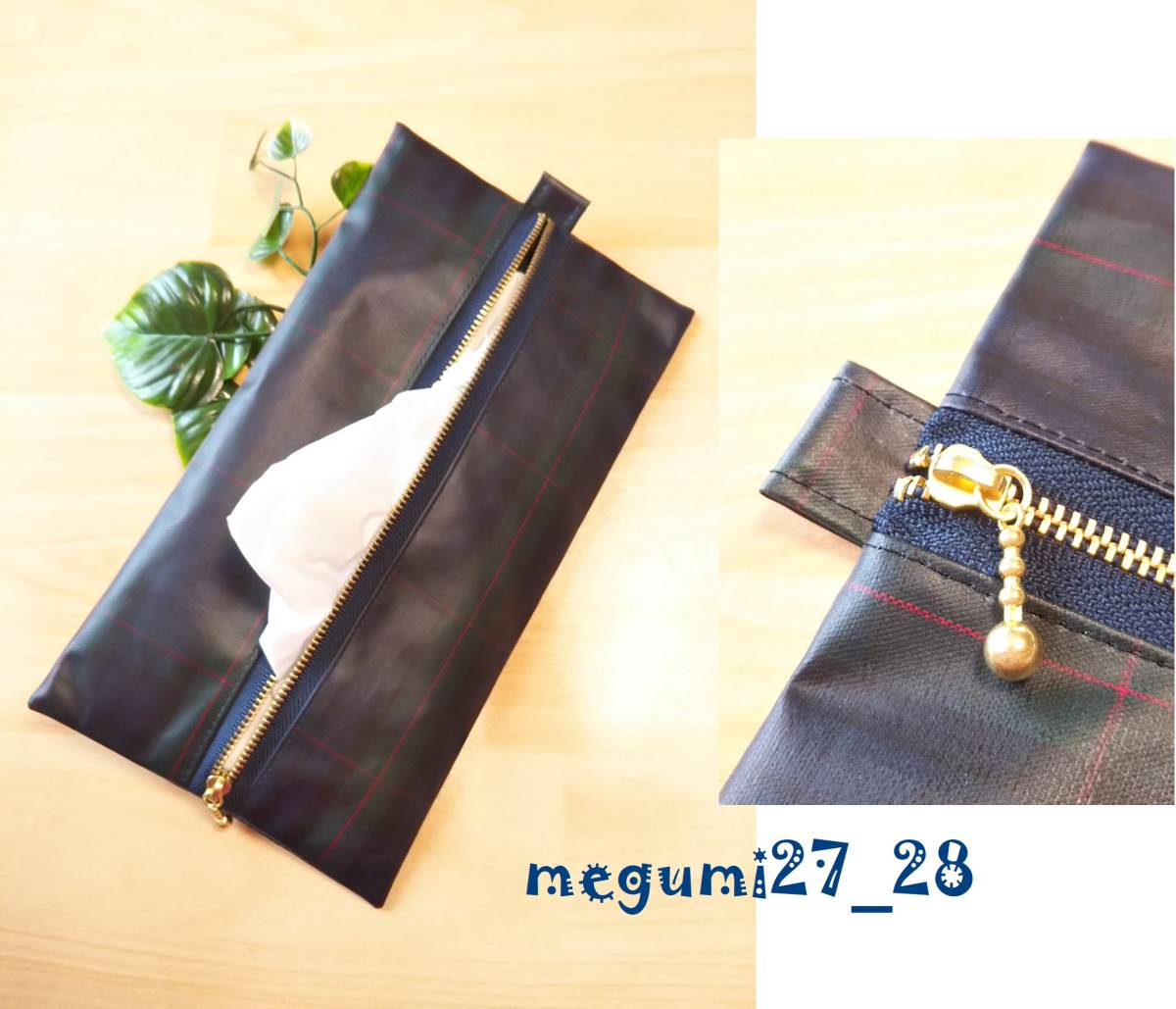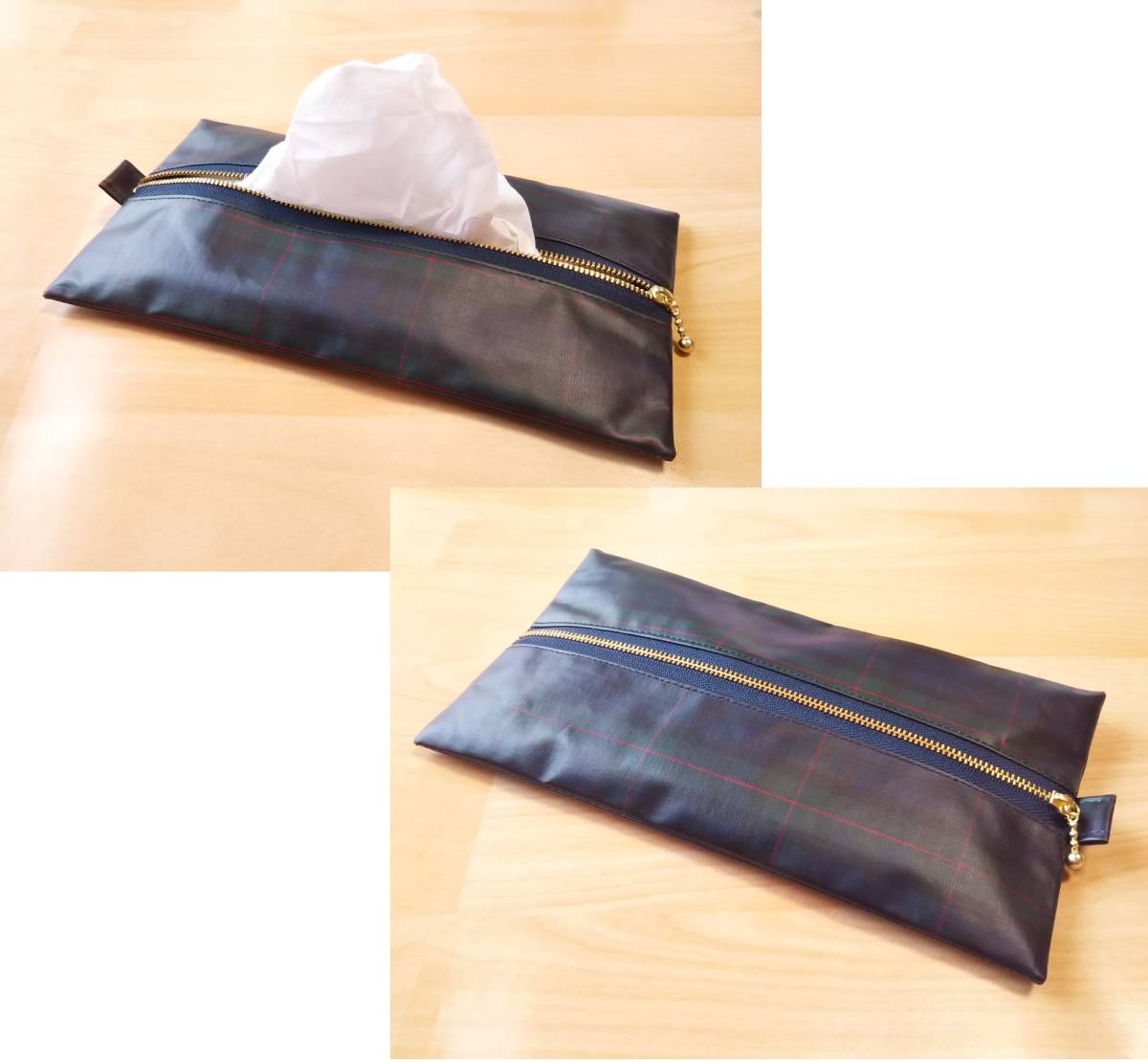 <ティッシュケース(玉付きファスナー)>タータンチェック紺緑◆ハンドメイド◆ラミネート加工