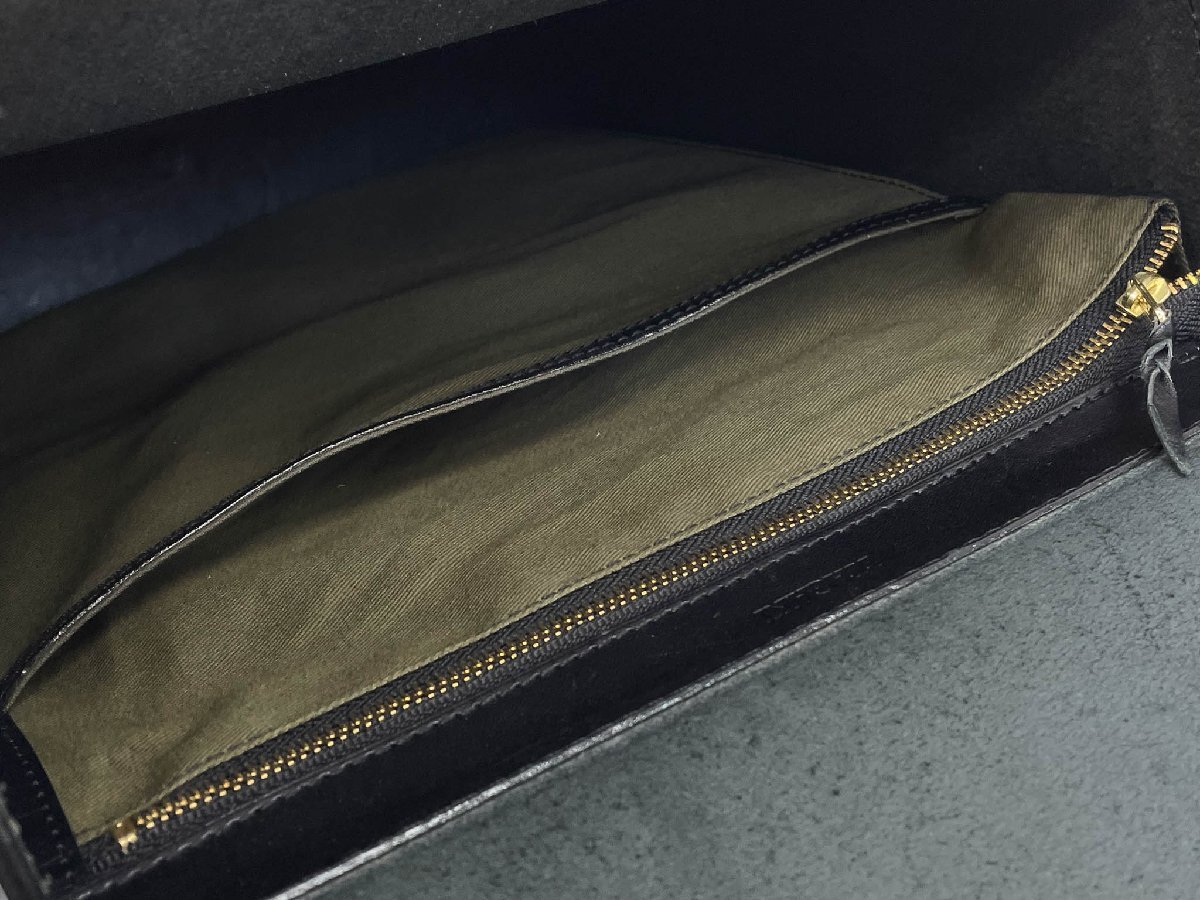 ・内装・・・吊り平ポケット×1とファスナーポケット×1、フラップ下に浅めのオープンポケット×1