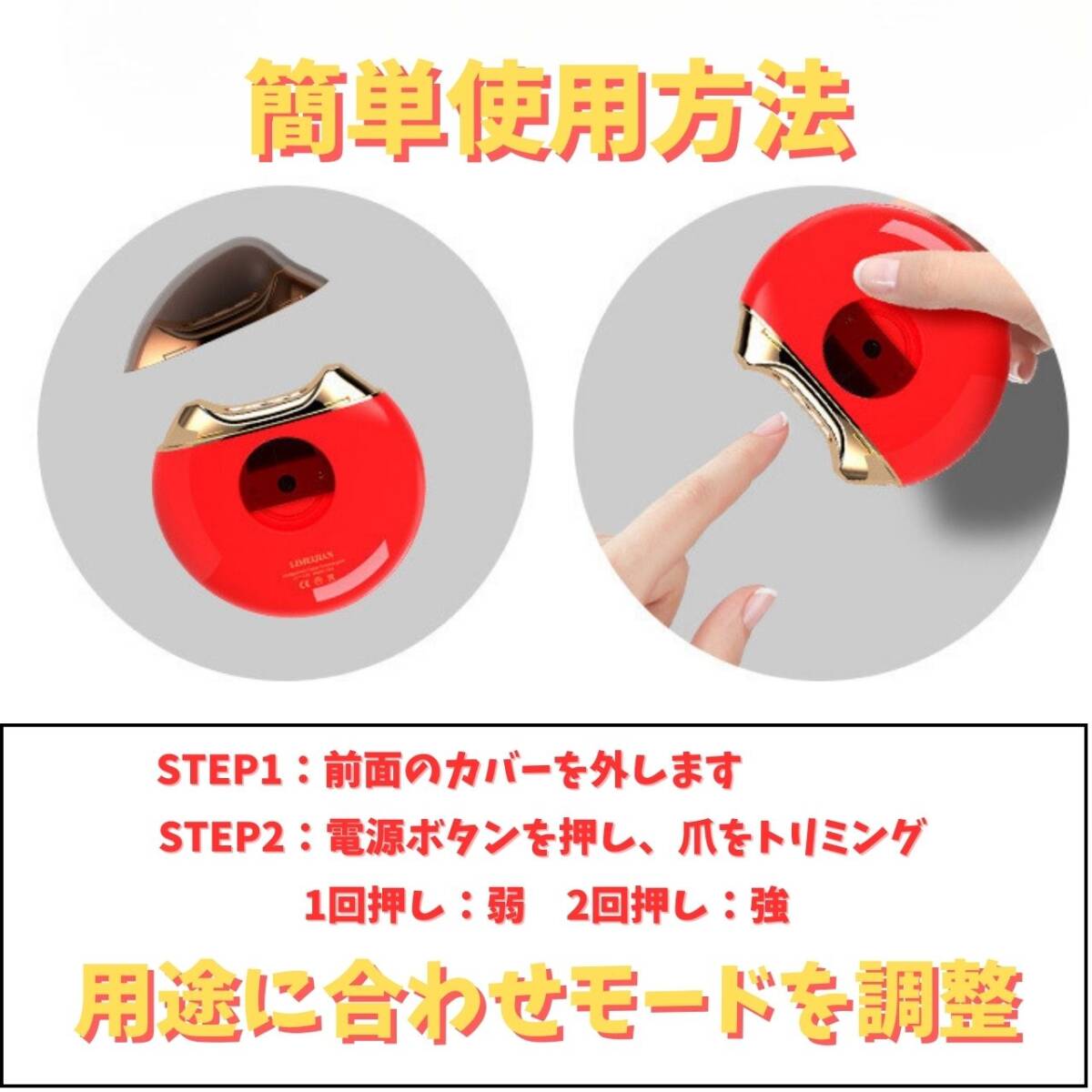 指先からの華やかな輝き。エレガントなデザインで持ち運びが簡単。あなたの美を磨く電動爪やすり【使用方法】1.フロントカバーを開く2.電源スイッチを押す※2段階のスピード調節ができます。電源スイッチ★1回押し:お子さまに適した速さで回転し★2回押し:大人に適した速さで回転します。45度の角度で刃が回転して安全にけずれるようになってます。削れた爪のカスは飛散ることなく内部のBOXに集められます。捨てる際も楽々お掃除!静音で削る際の音が気になりません!【USB充電】30分充電で毎回6~10分で計算して約60回 MAX充電で約2か月くらい使用できます。【サイズ】約78x80x厚さ33mm*サイズは多少の誤差があるかもしれません。【重量】約95g【カラー】タイトル、商品画像1枚目をご確認ください。ご注意:PC環境により写真の色味など若干実物とイメージと異なることがあります。【注意事項】・海外製品のため多少の傷や汚れ等ある場合がございます。・送料の都合上箱なし、簡易包装での発送となります。コメントなしでの即購入OKです。おまとめ買いでお値引きさせていただきます。お気軽にコメントください。電動爪切り 電動爪やすり 電動爪削り足 赤ちゃん 介護 つめやすり 高齢者 足爪 USB充電 ネイルアートネイルケア コンパクト 安全 父の日 敬老の日 母の日 プレゼント ギフト 指ホワイト ブラック レッド 白 黒 赤