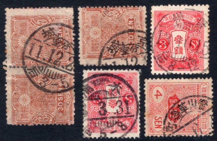 櫛型印 朝鮮使用5点, D欄:分室 京城局消し 旧大正毛紙30銭再接ペア,同3銭 木浦局消し,昭和白紙3銭 晋州局印消し他、大正11-昭和13年使用、