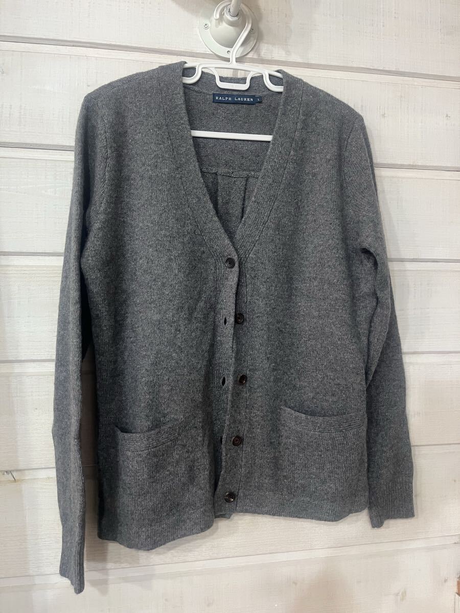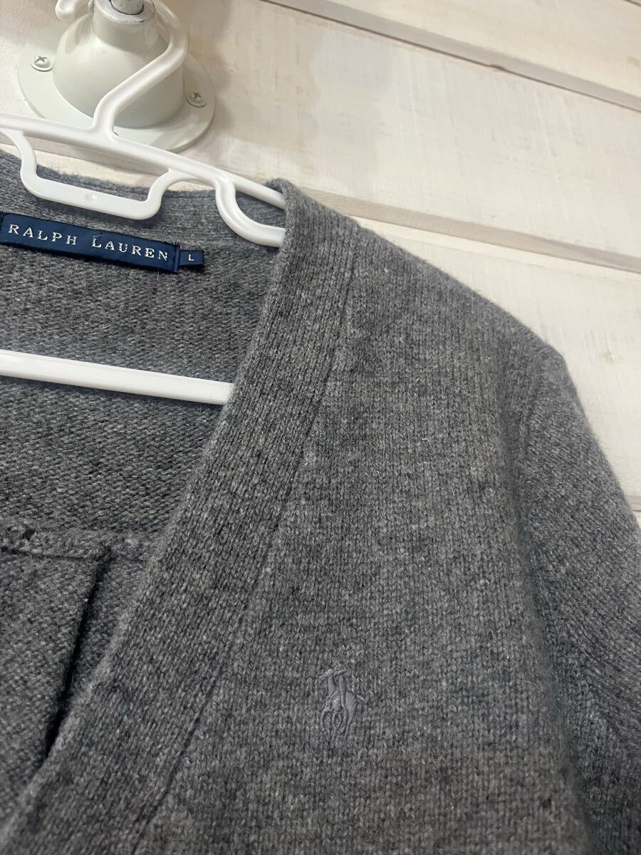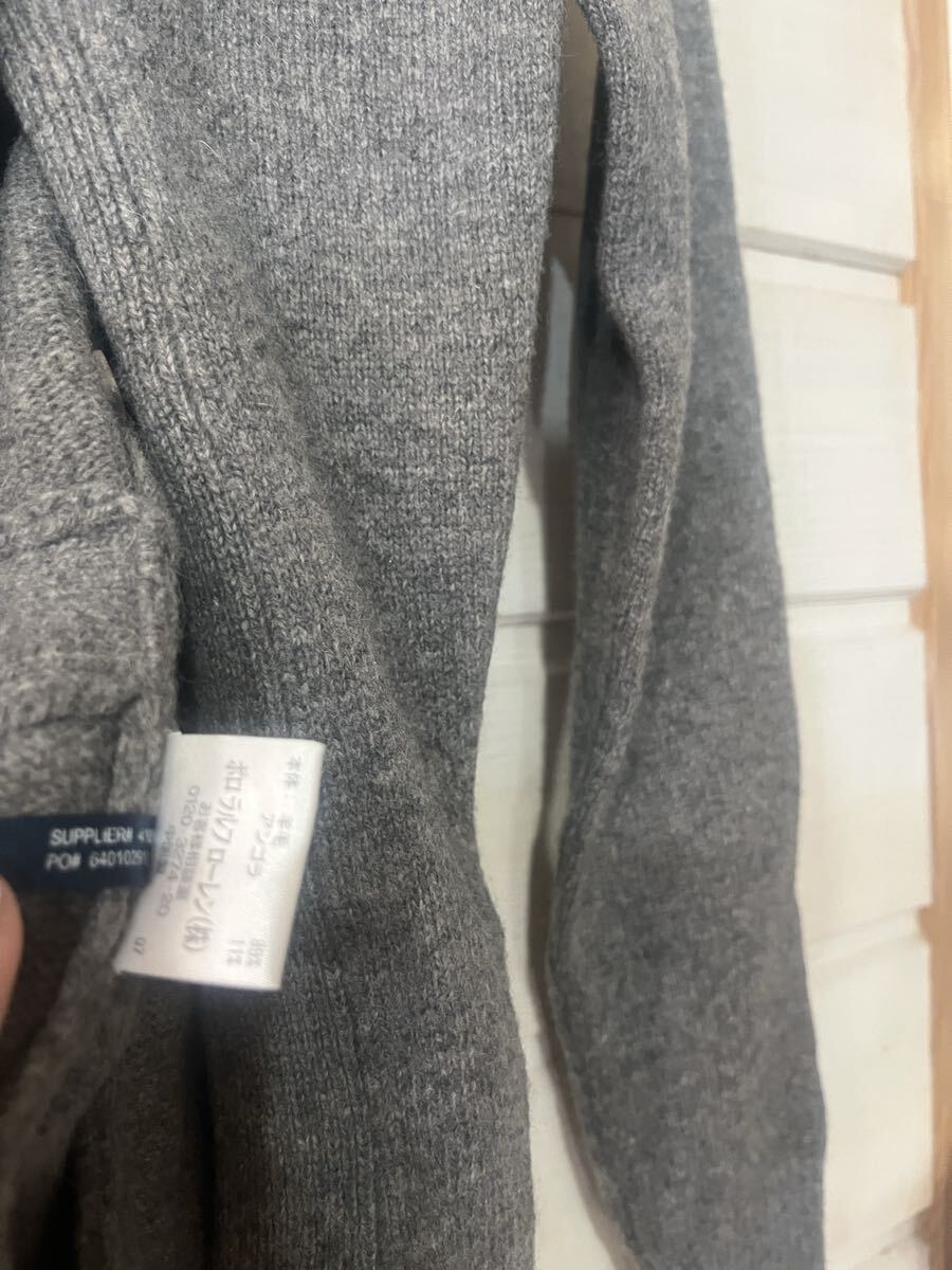 ラルフローレンになります。サイズはL。羊毛89、アンゴラ11。グレー。数回着用、目立つ汚れは見当たりません。