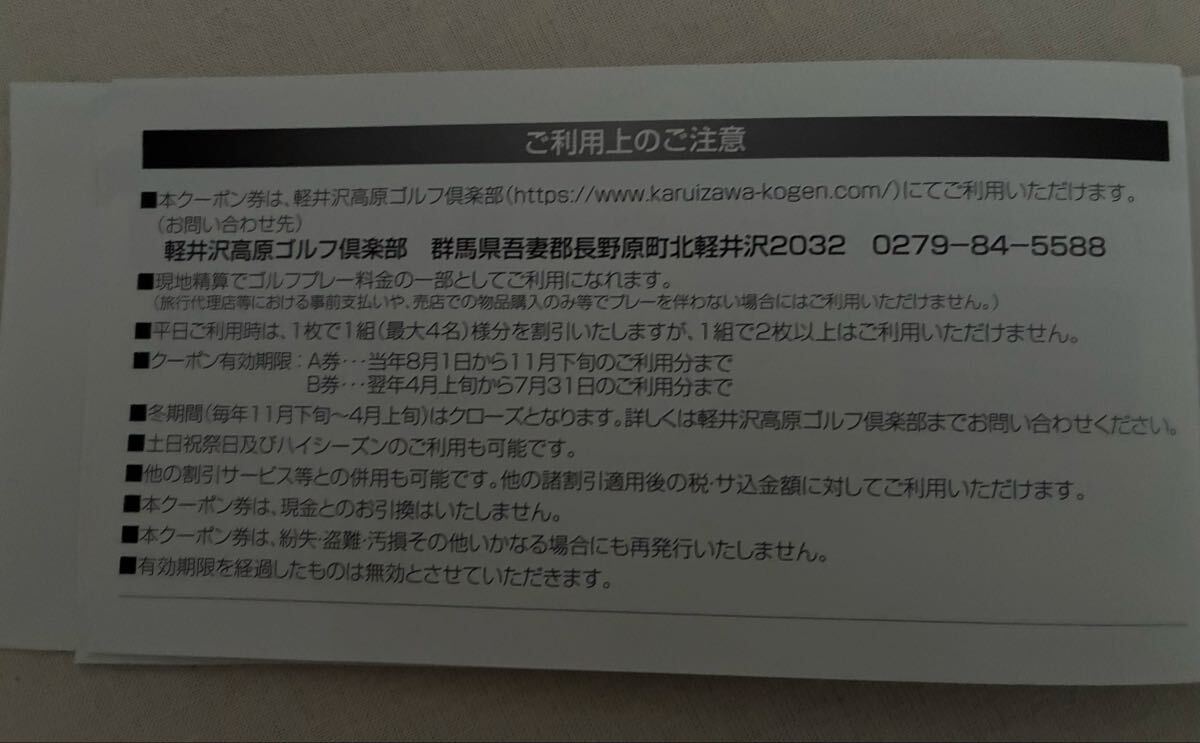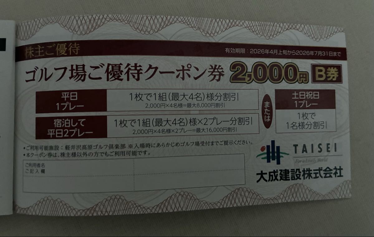 大成建設株主優待券 ゴルフ場優待クーポン券 B券 軽井沢高原ゴルフ倶楽部 有効期限2026.7.31