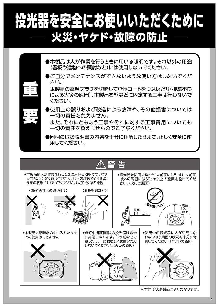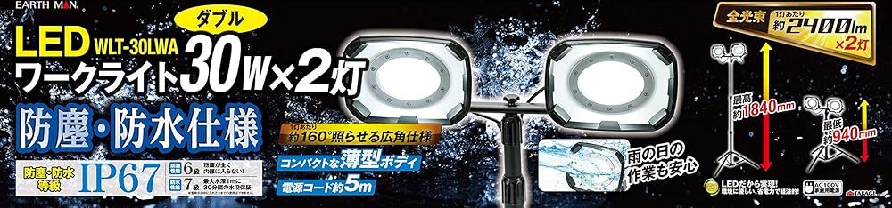 「商品情報」夜間・暗い所での作業に雨中での作業に防塵・防水仕様 IP67防塵性能6級:粉塵が全く中に入らない防水性能7級:最大水深1mに30分間の水没保証雨の日の作業も安心全光束:1灯あたり約2400lm1灯あたり約160°照らせる広角仕様コンパクトな薄型ボディ電源コード約5mLEDだから実現! 環境に優しい省電力で経済的AC100V家庭用電源「主な仕様」電圧:AC100V、周波数:50/60Hz、電流:0.92A(0.46A+0.46A)、定格消費電力:最大60W(30W+30W)使用電球:白色LED1W×36×2灯(交換不可)、全光束:約2400lm×2灯※公的機関での測定値、設置場所:室内・屋外、正面照度:約1550lx本体サイズ:約長さ720×幅830×高さ940~1840(mm)、収納時サイズ:約長さ100×幅610×高さ890(mm)コード長:約5m、質量:約4.5kgセット内容:ワークライト本体×1(ジョイントケース接続)、スタンド×1、ブラケットスティ×1、取扱説明書×1