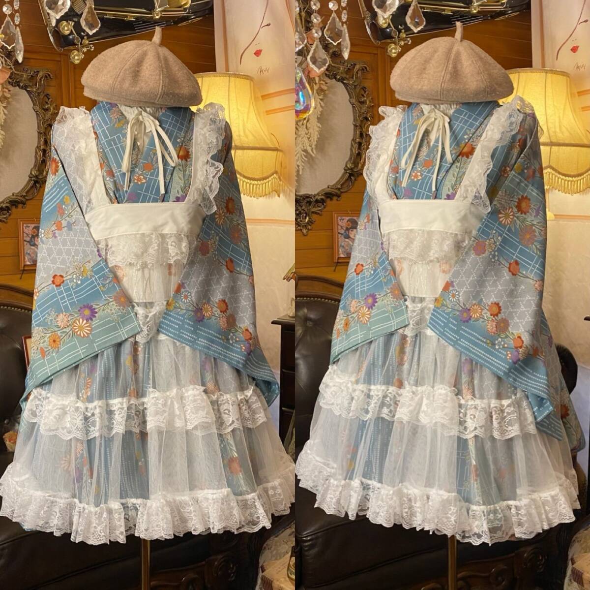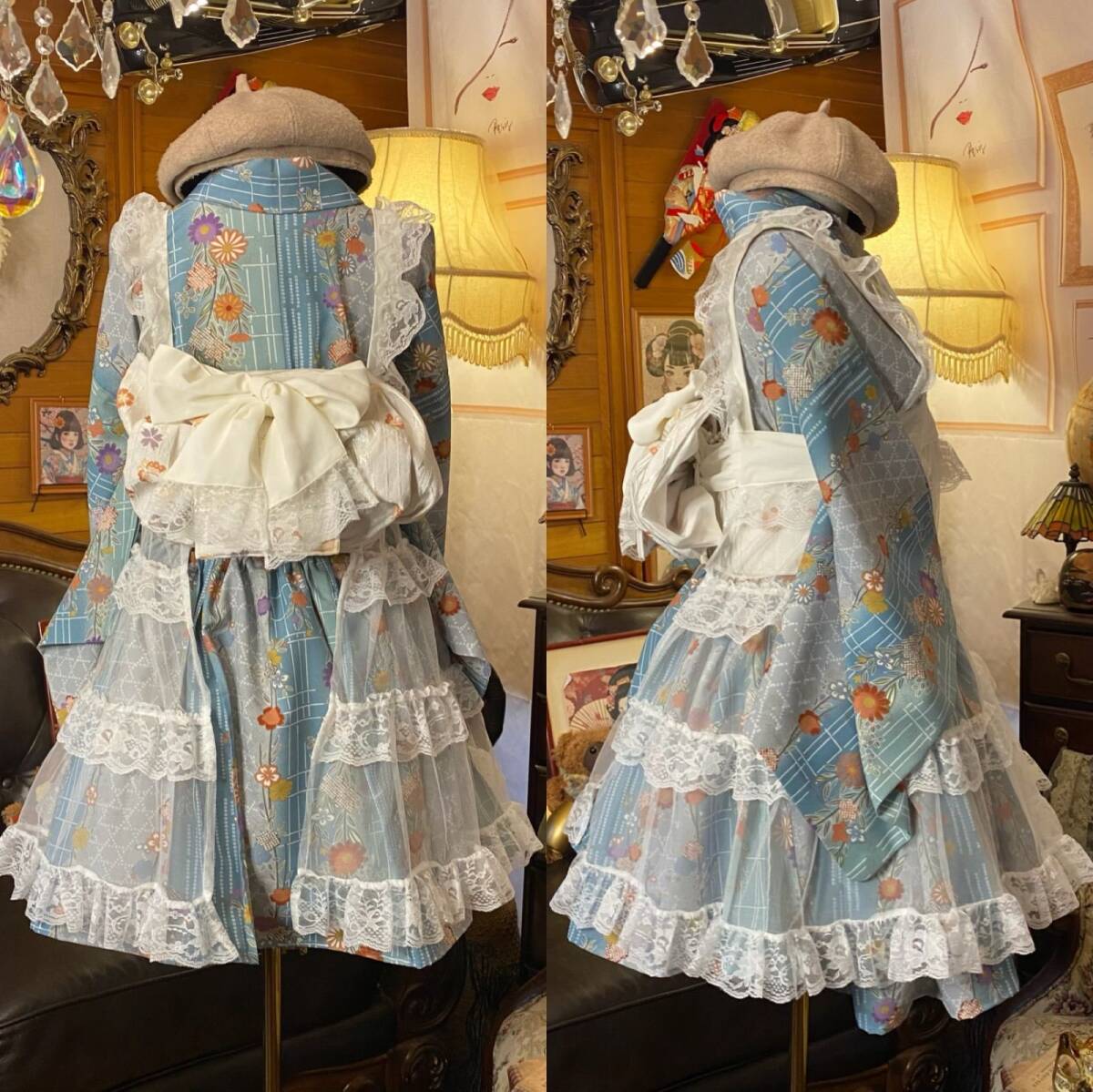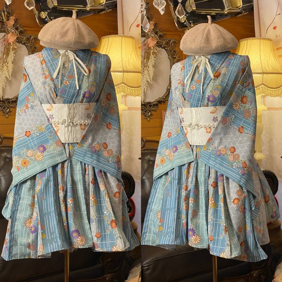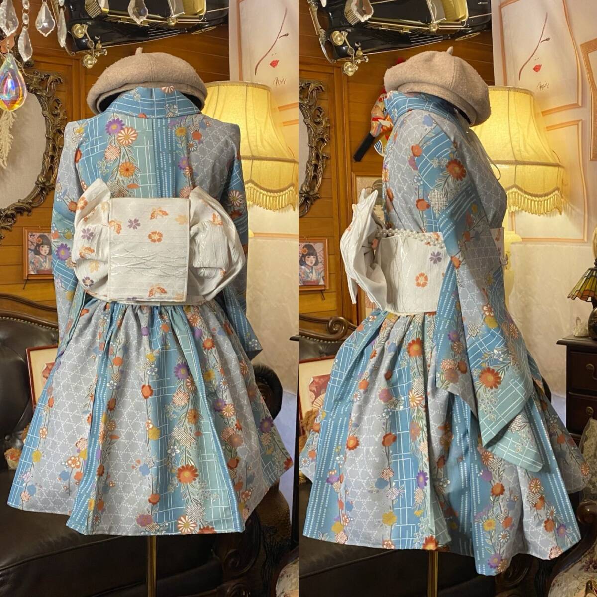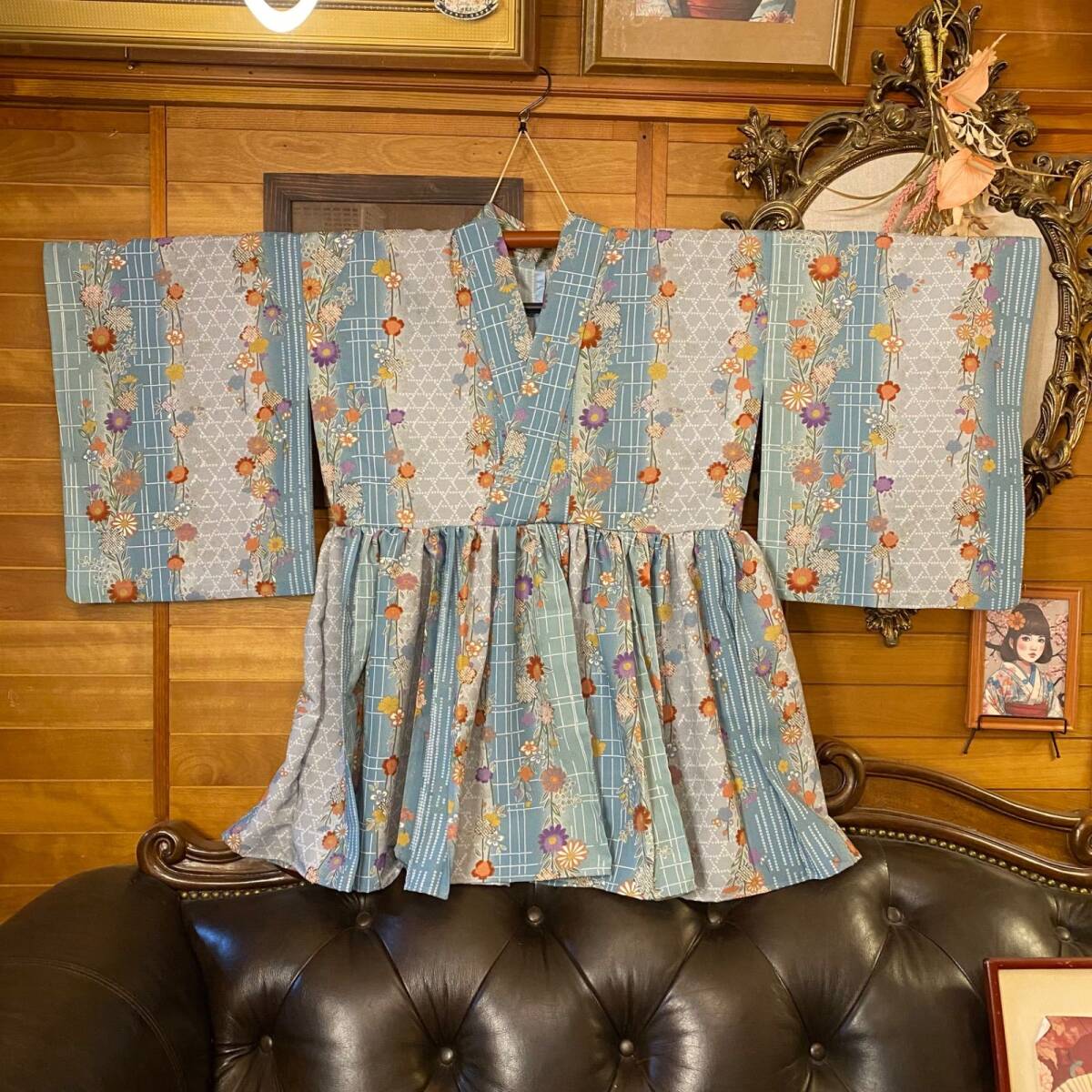 【 着物 ミニ丈 ワンピース ドレス 和ロリ 2部式作り帯 京袋帯 お太鼓 リメイク 和洋折衷 洗える 化繊 ハンドメイド レトロ 古着 単衣 freeサイズ アンティークの息吹をまとう、花舞う MKW-44 】