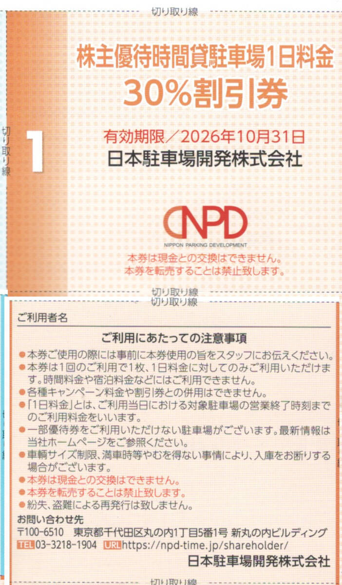 日本スキー場開発の株主優待券です 日本駐車場開発の経営する駐車場で1日料金が30%割引をうけられます