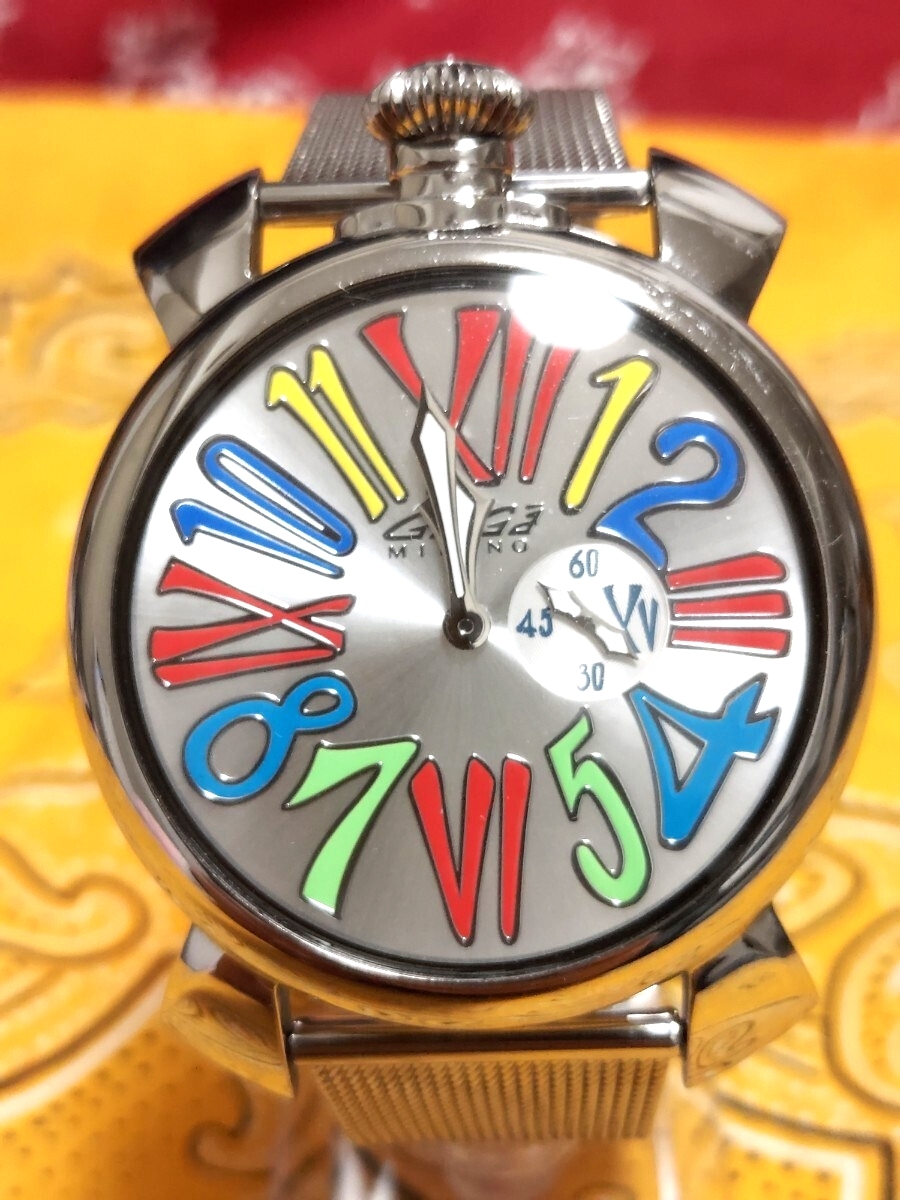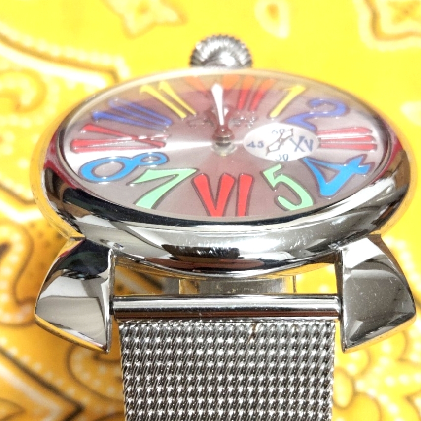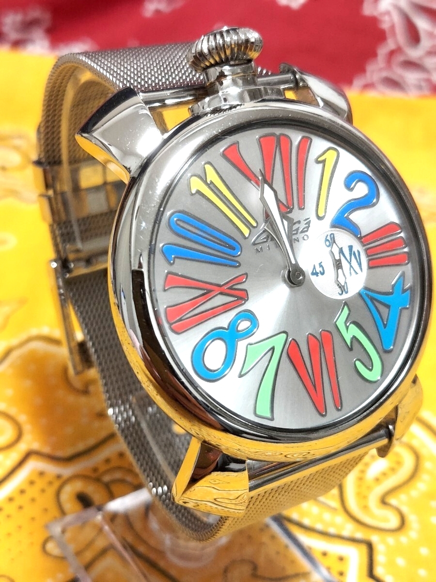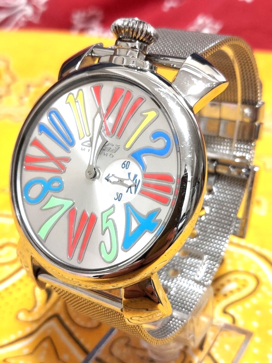 ガガミラノ マニュアーレ46 クォーツ マルチカラー シルバーケース、ホワイト文字盤 稼働品です。