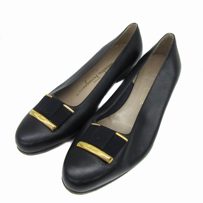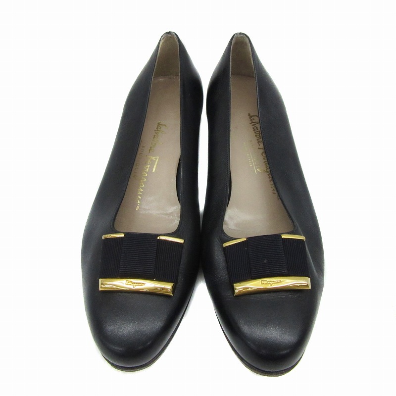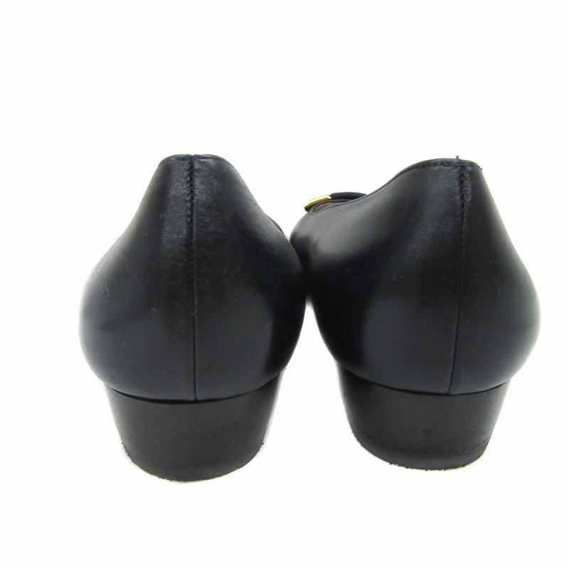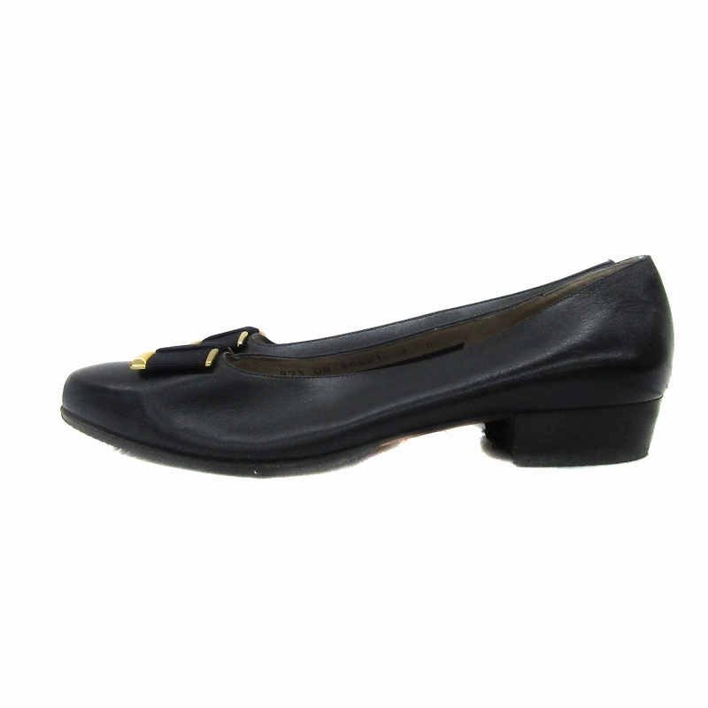 サルヴァトーレフェラガモ パンプス ラウンドトゥ チャンキーヒール ローヒール リボン レザー 7 24.1cm 紺 36421 ■GY53 レディース