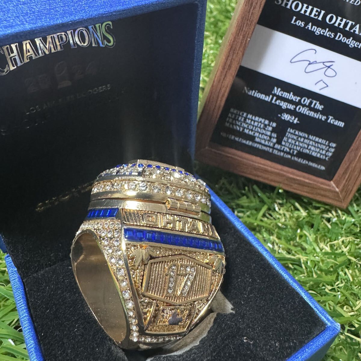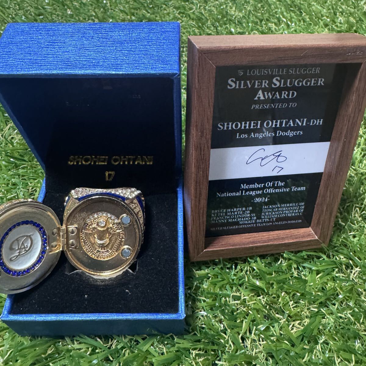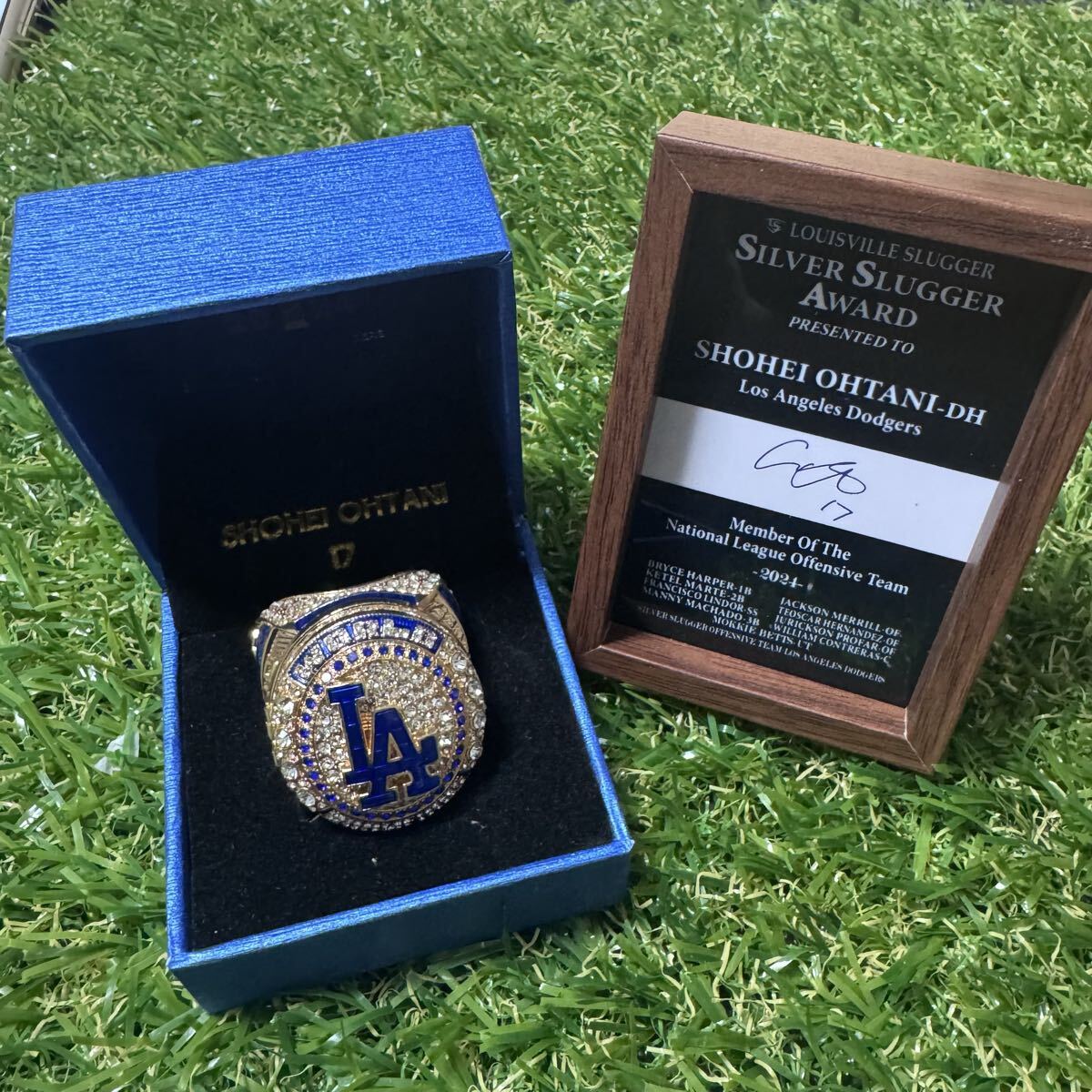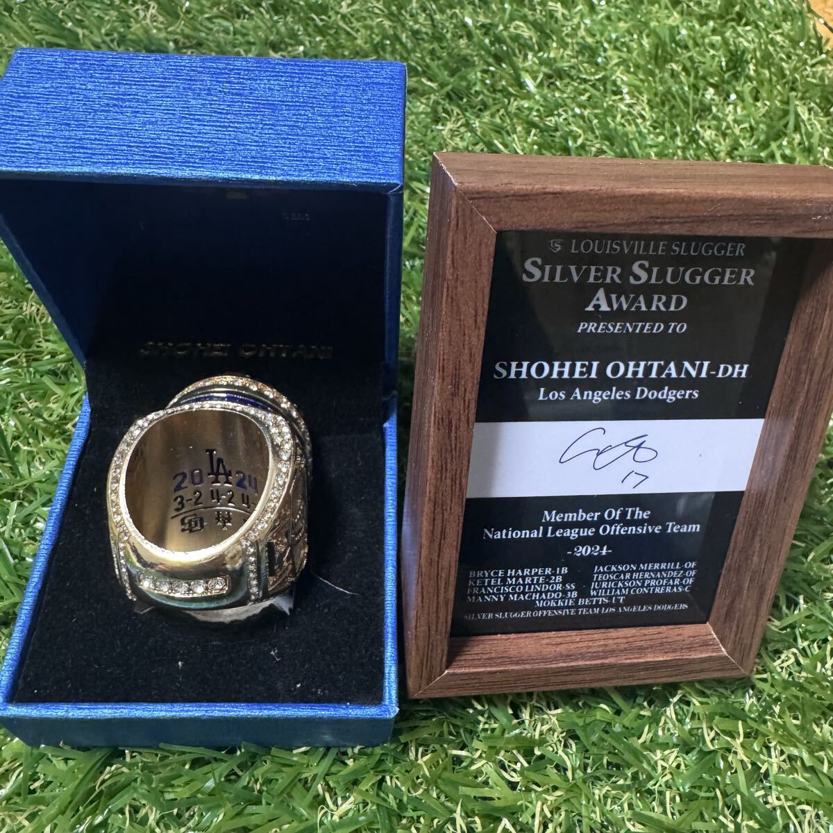 ドジャースのワールドチャンピオンセミオーセンティックリングと特製リングケース、サインプリントシルバースラッガー賞記念プレートのセットとなります。