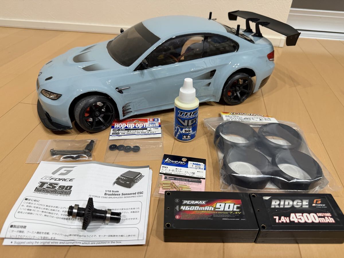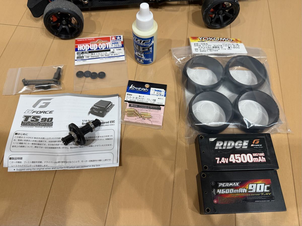 出品内容はシャーシとボディ、モーター、アンプ、ジャイロ、バッテリー、予備品となります。