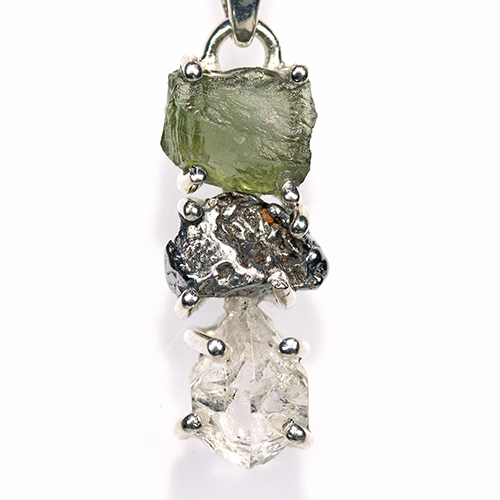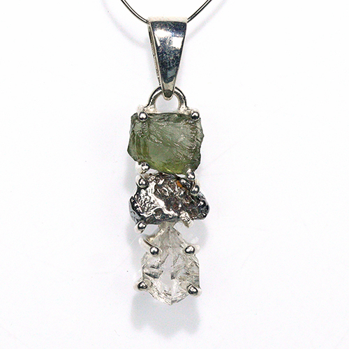 | 【 天然石 パワーストーン アクセサリー ファッション 雑貨 】 鉄隕石、「モルダバイト」原石、ハーキマーダイヤモンドのレアストーン3石の組み合わせが魅力的なシルバー925製ペンダントトップです。 【注意】 ※照明の具合で実際とは色合いが異なる場合があります。 ※内部に天然石特有の気泡・インクルージョン(不純物)等がある場合がございます。 | |||