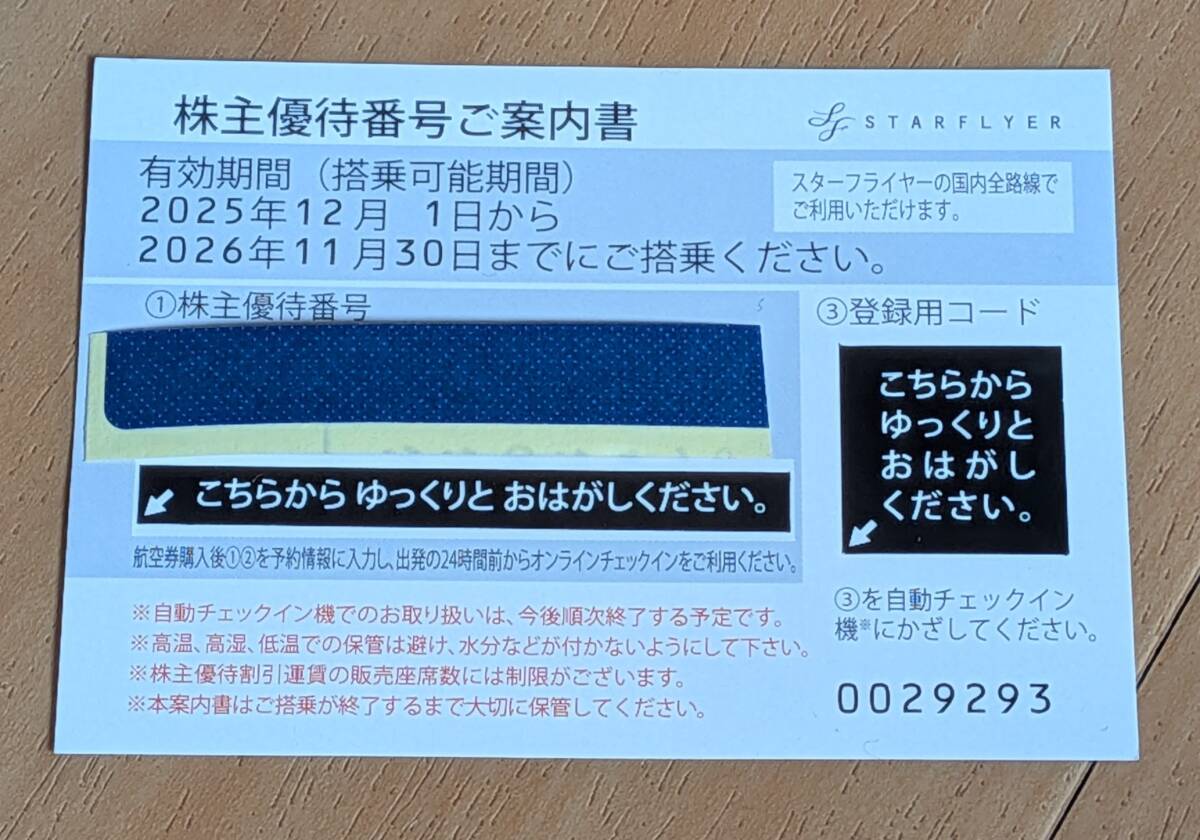 最新 スターフライヤー株主優待券 ③ 有効期間2025年12月1日~26年11月30日