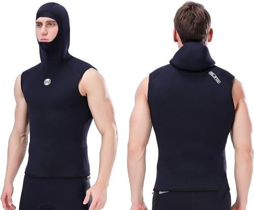 フード一体式で頭からしっかり保温、クラゲ、岩などへの擦り傷を防止します。胸に保護・減圧のデザイン。