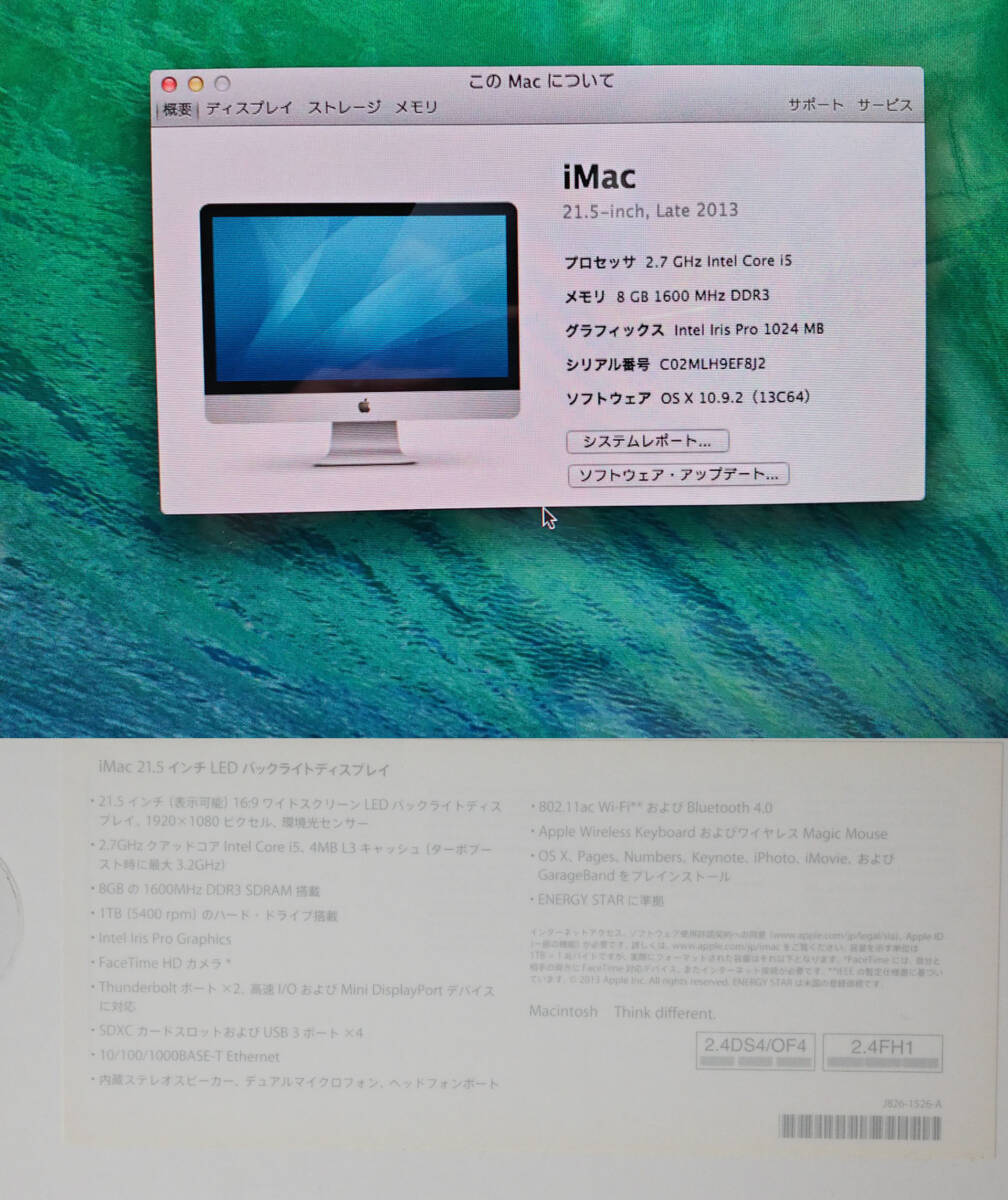 iMac 21.5インチ (Late 2013) Core i5 2.7GHz/8GB/1TB ME086J/A