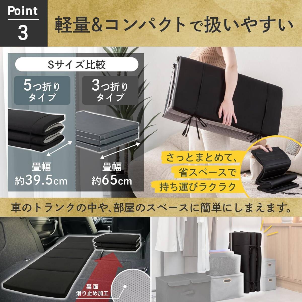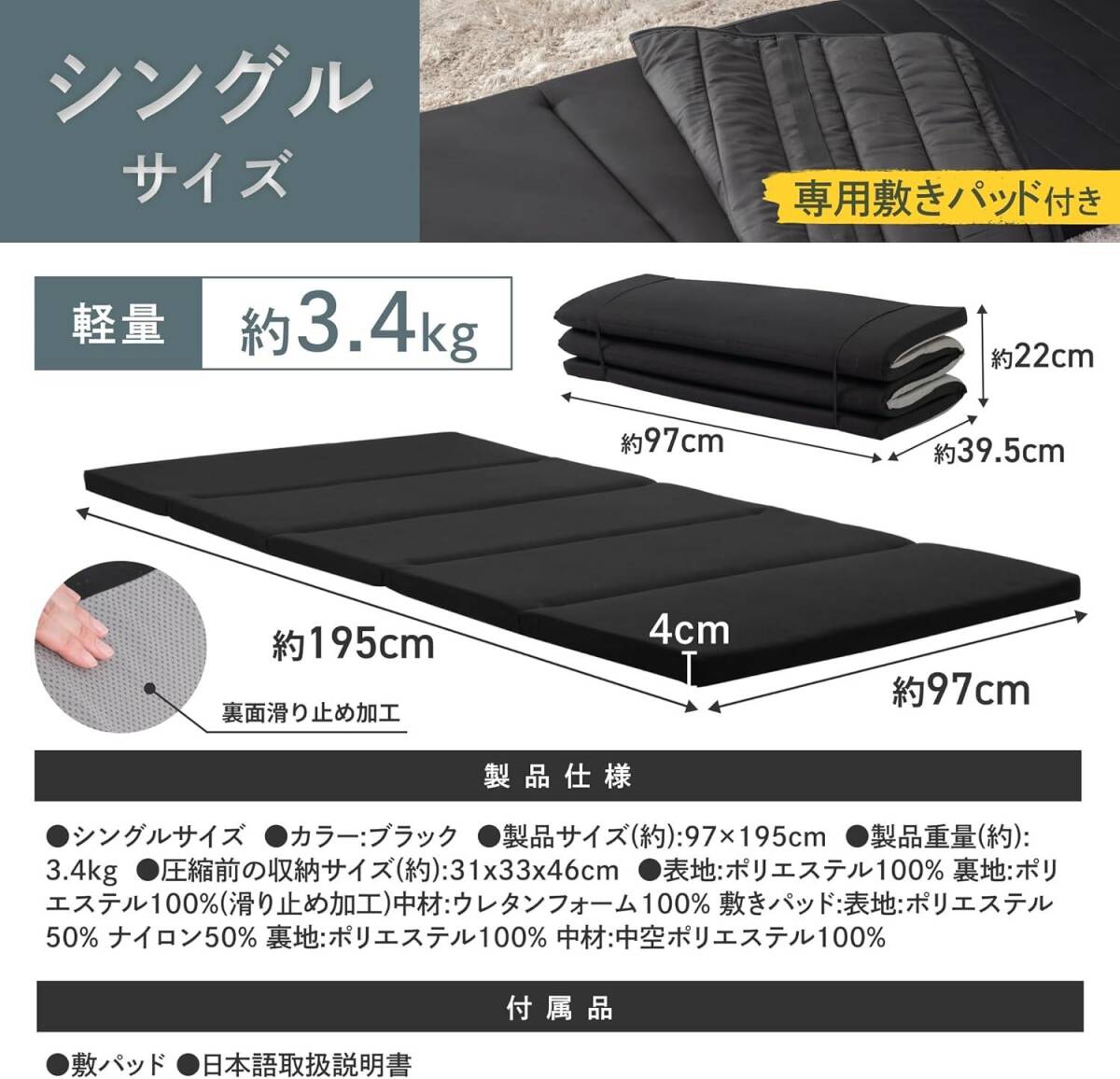 • 【サイズ】シングルサイズのマットレスで、97cm×195cm×4cmの厚みを持つコンパクト設計。