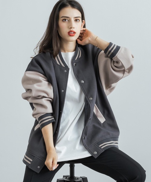 参考商品名:オーバーサイズ ウールテックメルトンスタジャン / フェイクレザー切り替えブルゾン