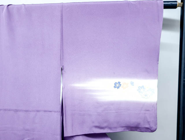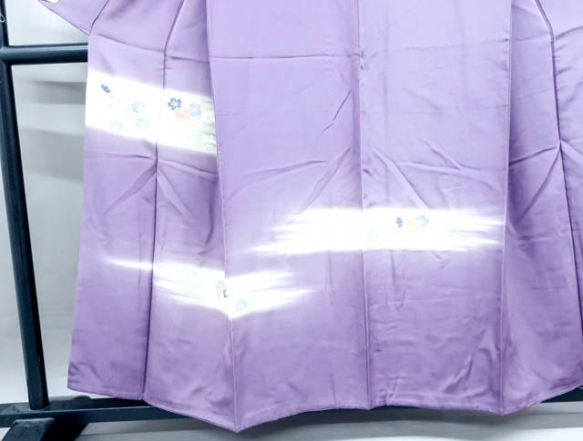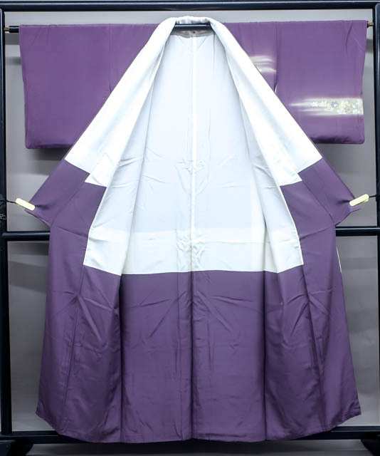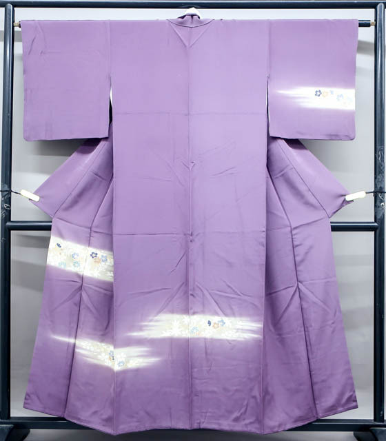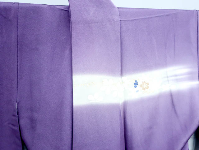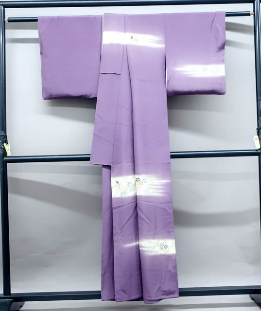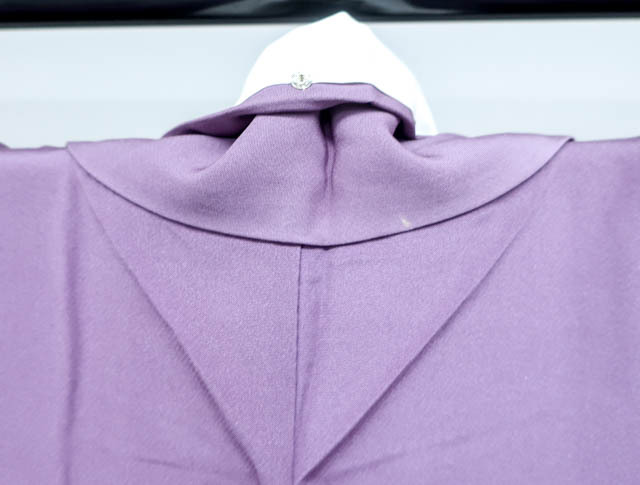 リサイクル商品のため、衿に薄汚れ、右胸、右後袖に薄いシミ、全体にヤケがございますが着用可能なお品です。 地色は、灰紫色です。 1枚目の画像が近いお色かと思われます。 素材は正絹です。 |