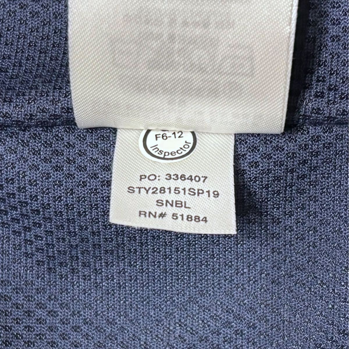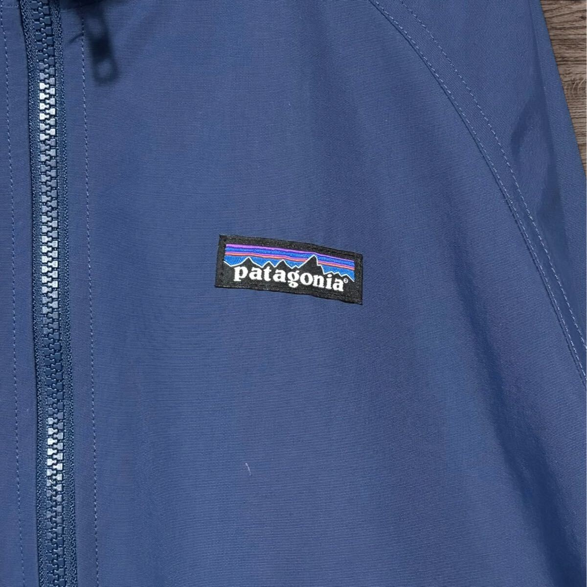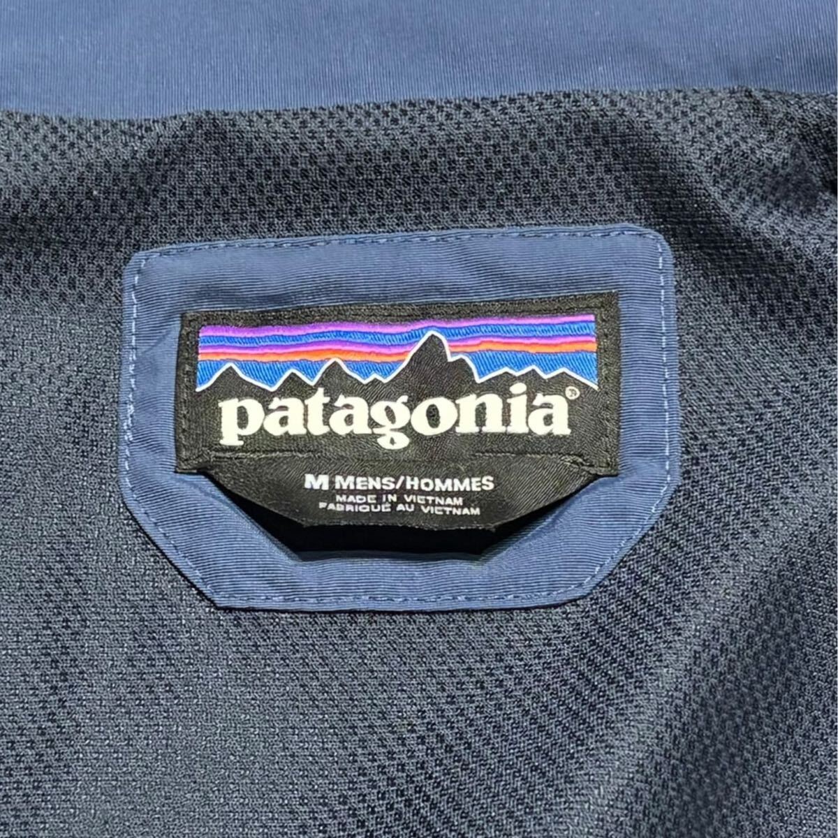 ネイビーのPatagoniaジャンパー、フルジップとサイドポケット付きで機能的。