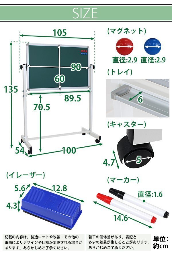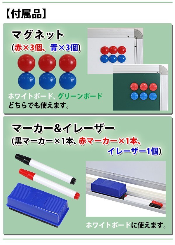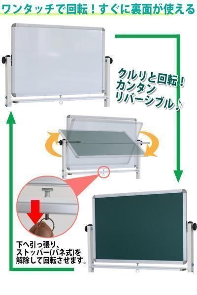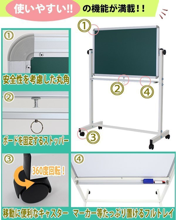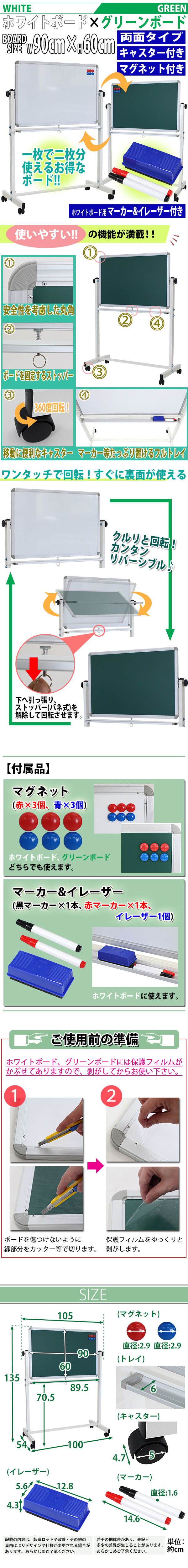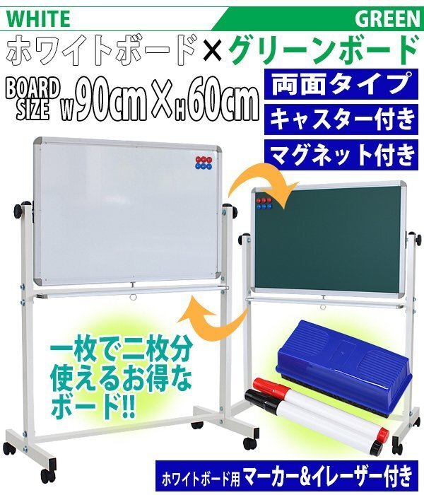 | 商品名 | 送料無料 新品 ホワイトボード グリーンボード W900xH600 両面 マーカー イレーザー マグネット付 チョークボード 回転式 がっちりフレーム 900x600 90x60 トレイ付き スタンド キャスター付き 脚付き アルミ枠 回転 白板 黒板 スチール 掲示板 ブラックボード 9060wg |