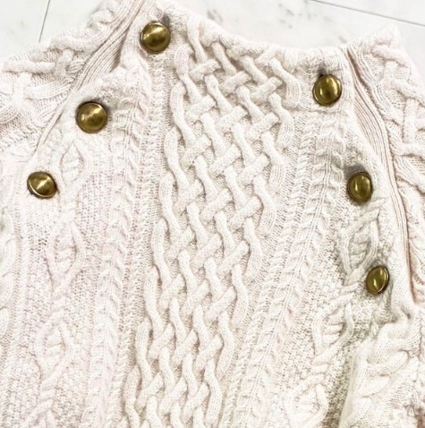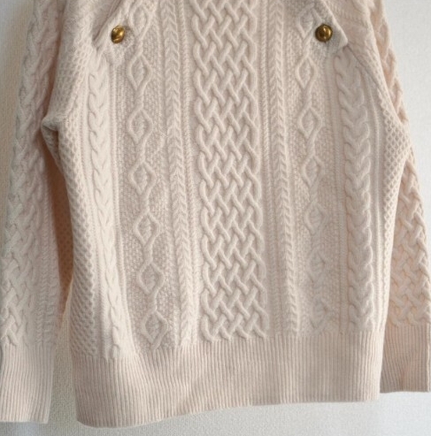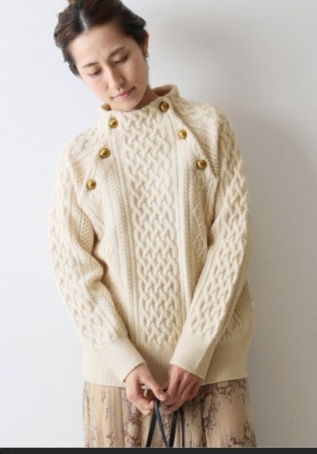 暖かみのあるアラン柄のニットプルオーバー。目を惹くフロントのメタル釦が新鮮な印象に仕上げてくれます。毛質がよく柔らかでふっくらとしたハミルトンウールを使用しているので高級感のある風合いです。滑らかな肌触りで着心地も抜群!!旬なボトルネックデザインで大人っぽさをプラス。