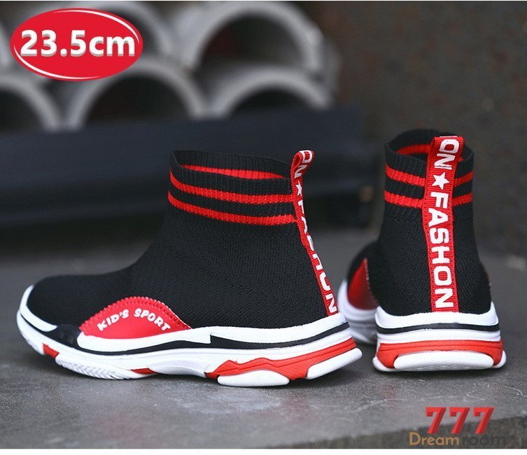 kids 夏用 ハイカット スニーカー 【ブラック×レッド 23.5cm】 韓国子供服 キッズ シューズ ニットスニーカー 子供用 男女