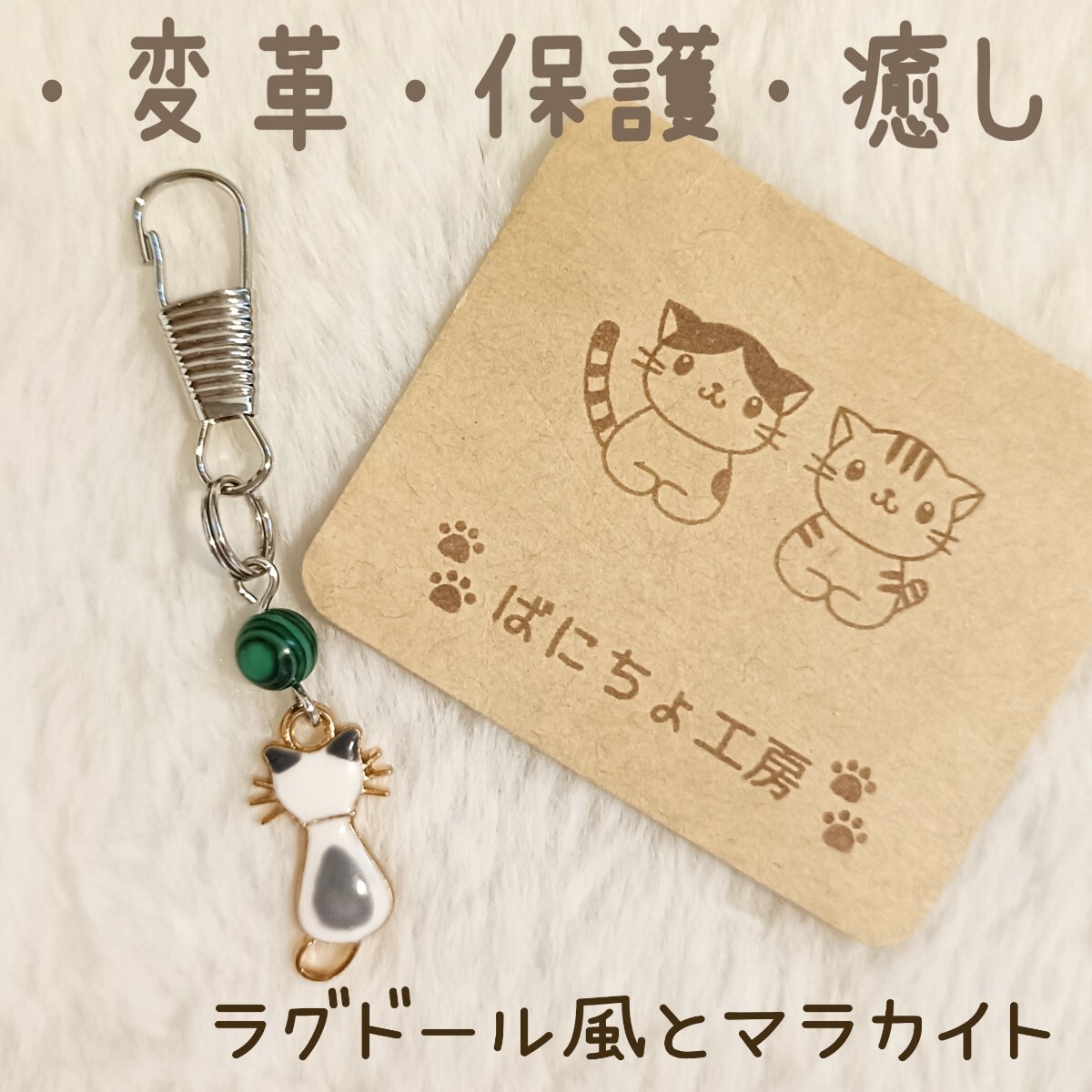ラグドール風ミックス「夢夢」をモデルに、6mm玉のマラカイトを合わせました。