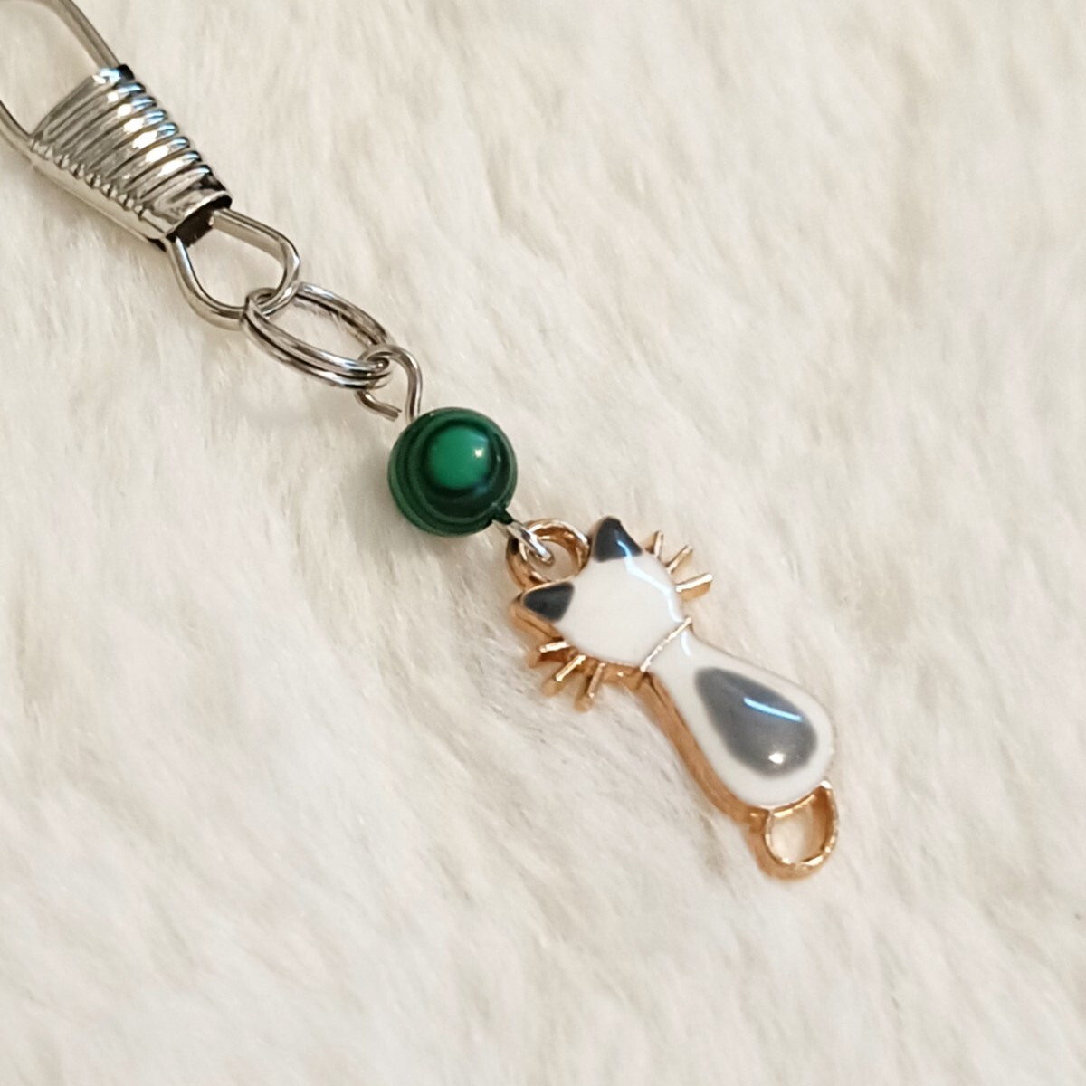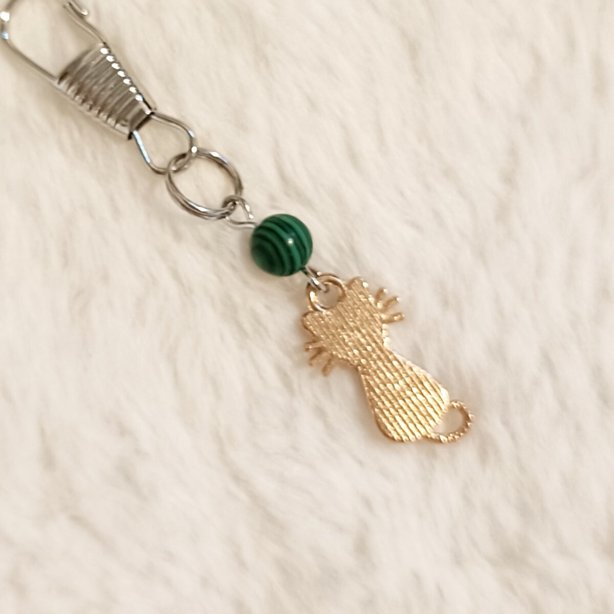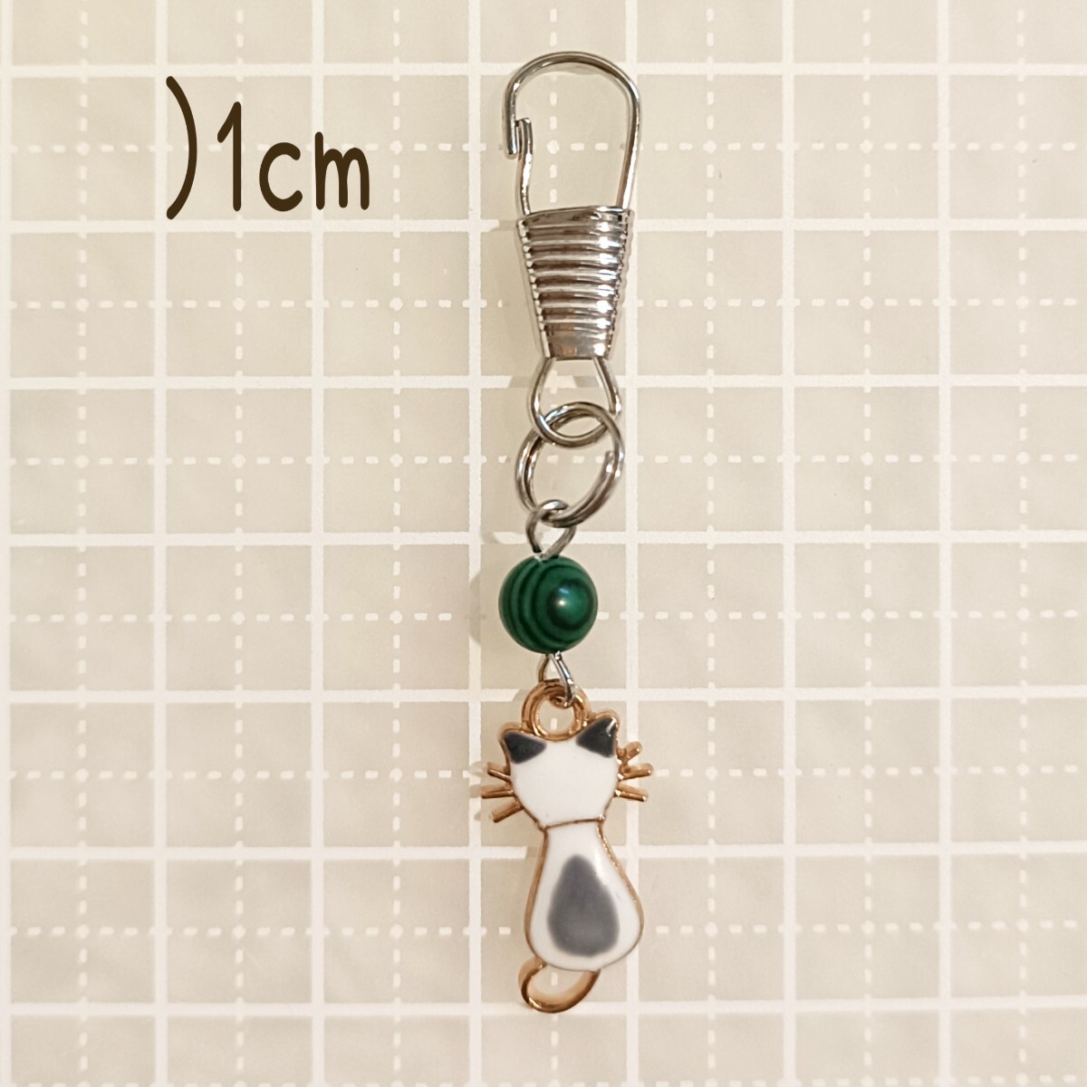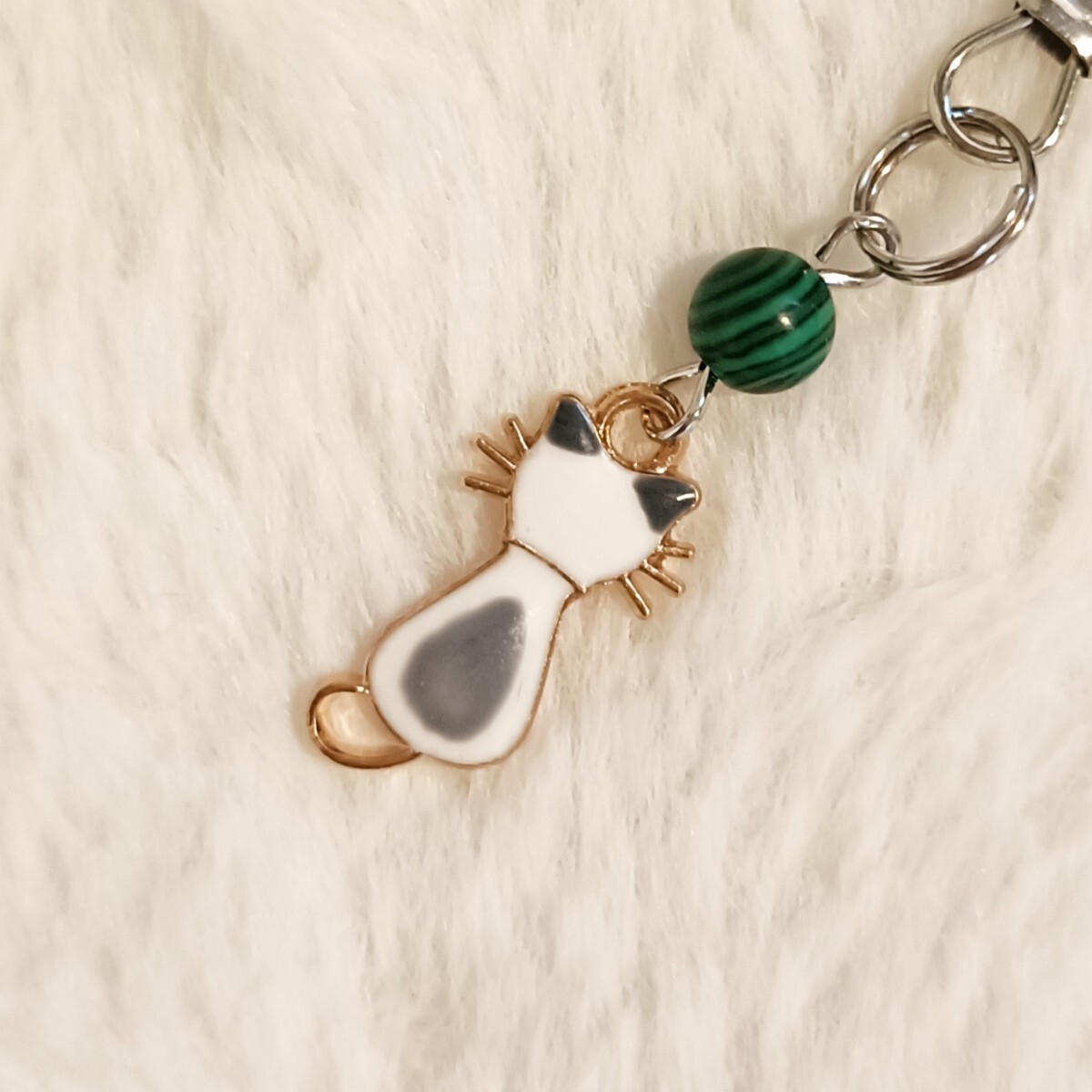 わが家のニャンコたちをイメージして描いたチャームにパワーストーンを添えたキーホルダーです(=^・^=)