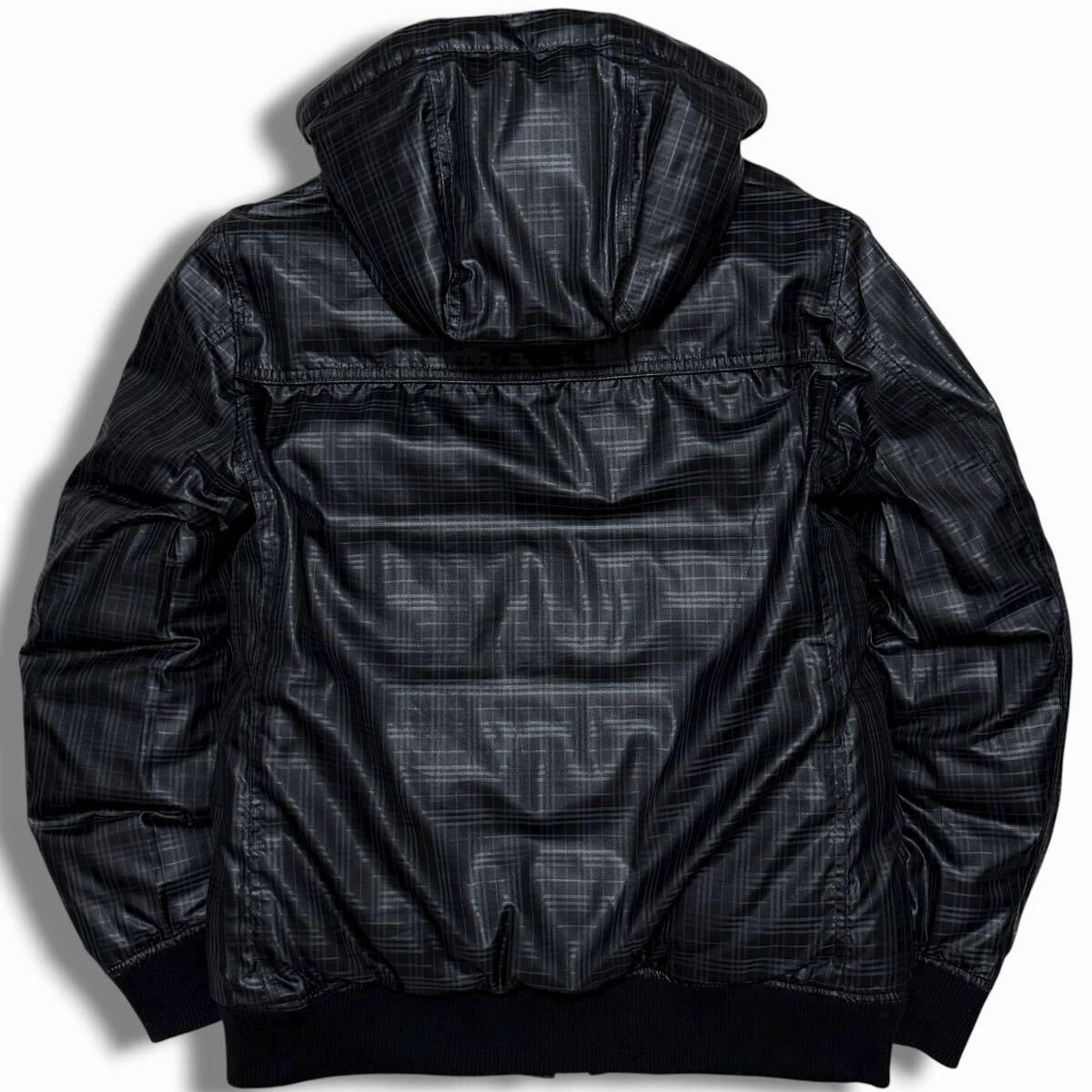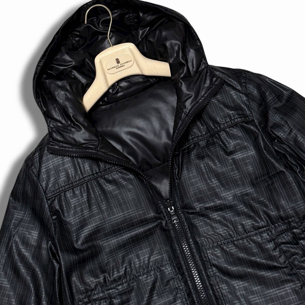 ファーこそ欠損していますが、全体的に目立つ汚れやダメージはなく極美品のコンディション。街の灯りに反射してほのかに光るシャドーチェックの陰影、そして艶やかな漆黒が重なる姿は、冬の大人の羽織りとして申し分ない風格を誇ります。